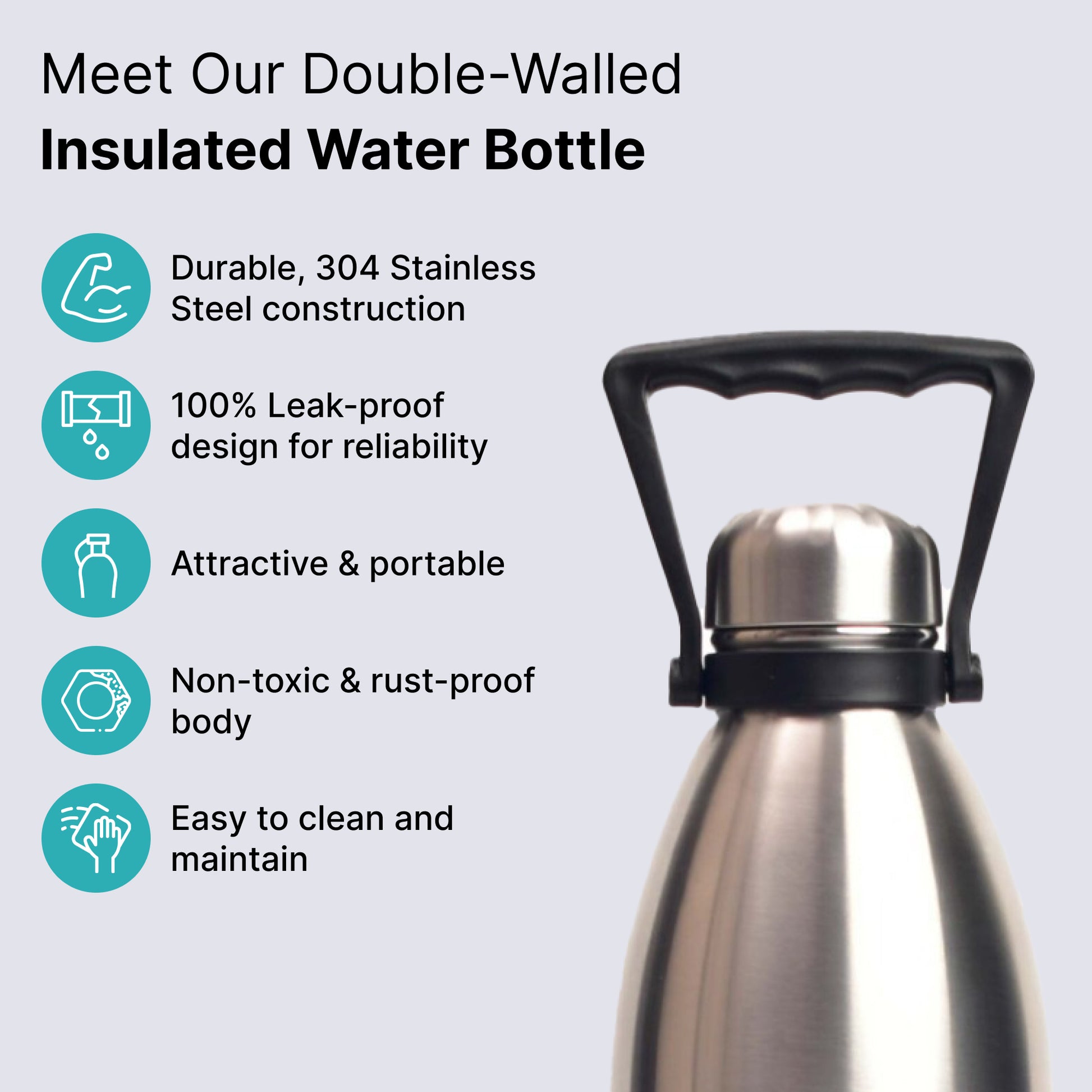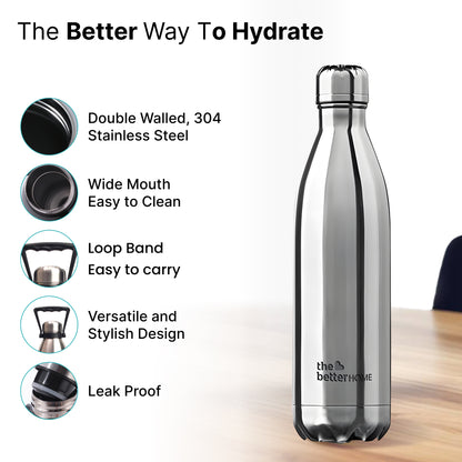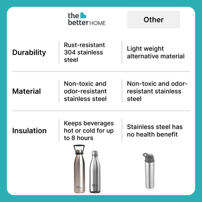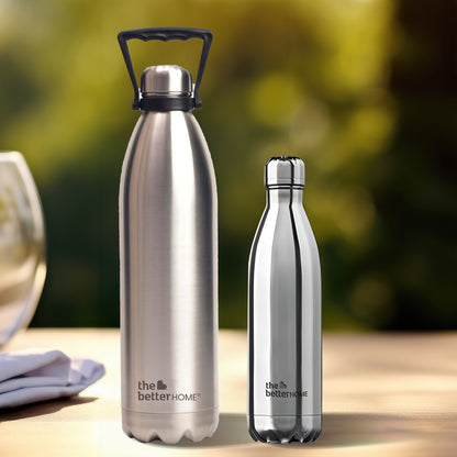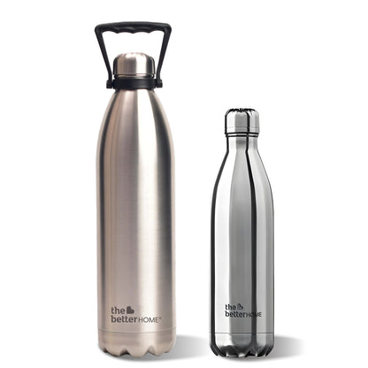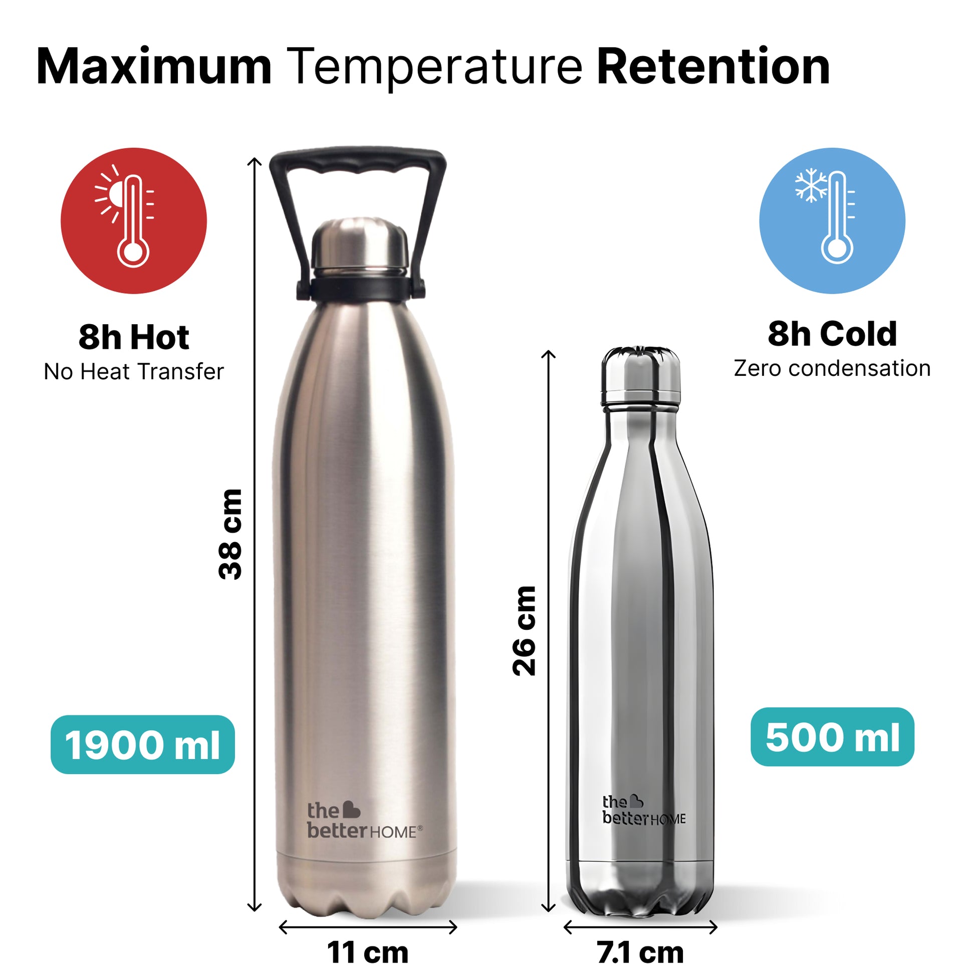The Better Home (Pack of 2-500ml and 1900ml) | Thermosteel Bottle | Doubled Wall 304 Stainless Steel | Stays Hot for 8 Hrs & 8 Cold for Hrs | Leakproof | Insulated Water Bottles for Office | Silver ATTRACTIVE DESIGN & COLORS: The Better Home bottle boasts an attractive design with trendy colors. VERSATILE USE CASES: Perfect for kids, this bottle is suitable for school, gym & office. Eco-Friendly: The Better Home Insulated Stainless Steel Bottle is eco-friendly & reduce plastic use.