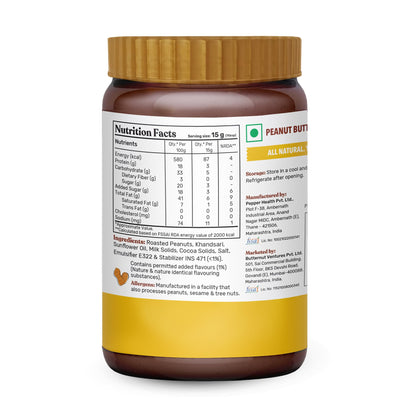 Introducing the 800 g Crunchy Chocolate Peanut Butter by The Butternut Co., a delightful combination of fresh peanuts and rich cocoa. With each jar, you get a perfect blend of taste and nutrition. This high protein treat boasts 18 g of protein per serving, making it a fantastic option for breakfast or a quick snack. It's made from 100% natural ingredients with no cholesterol and no trans-fats, ensuring it's healthy for the entire family!