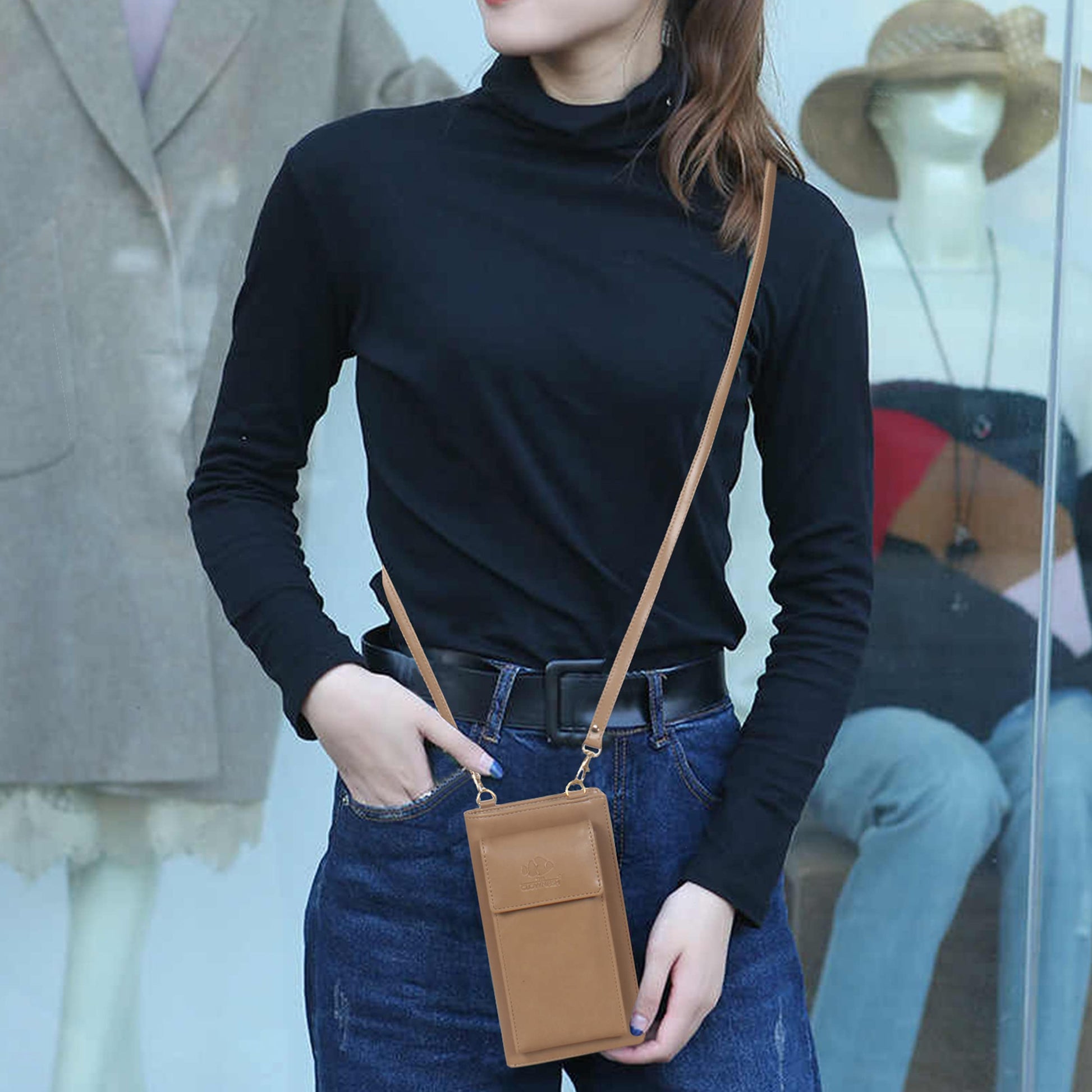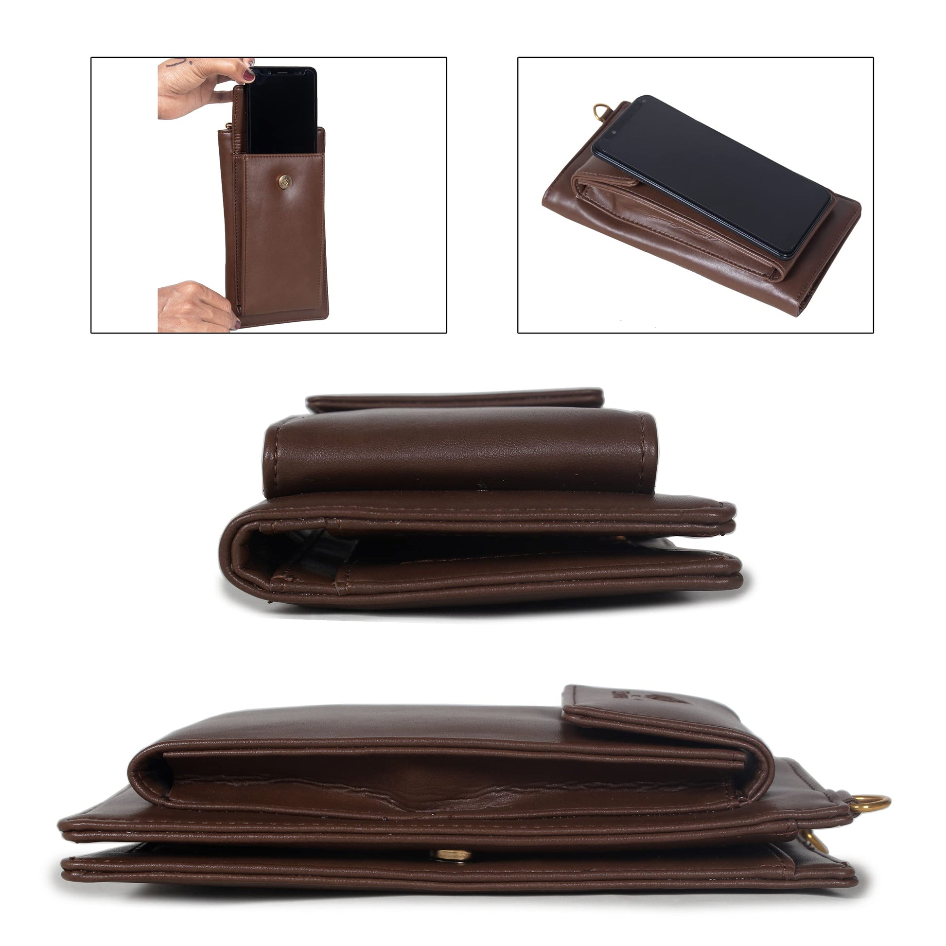 The most needed front phone pocket with snap flap closure and a slim shoulder belt gives an elegant look to the wallet and can be used as a sling bag too.
