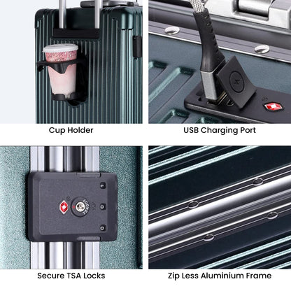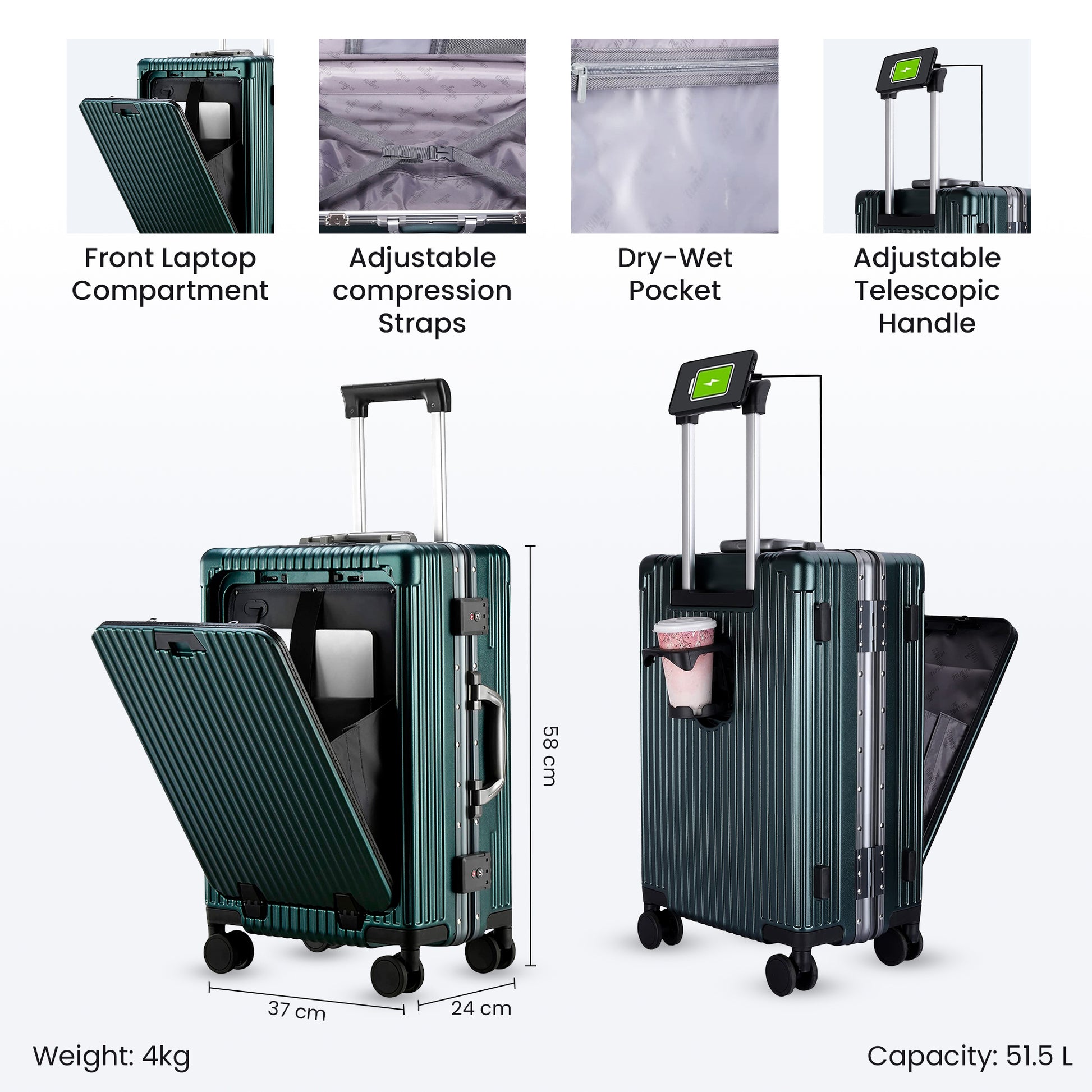 THE CLOWNFISH Ambassador Series Carry-On Luggage PolyCarbonate Hard Case Suitcase Eight Spinner Wheel Trolley Bag with TSA Lock, USB, Mobile Holder, Cup Holder- Forest Green (56 cm-22 inch)