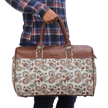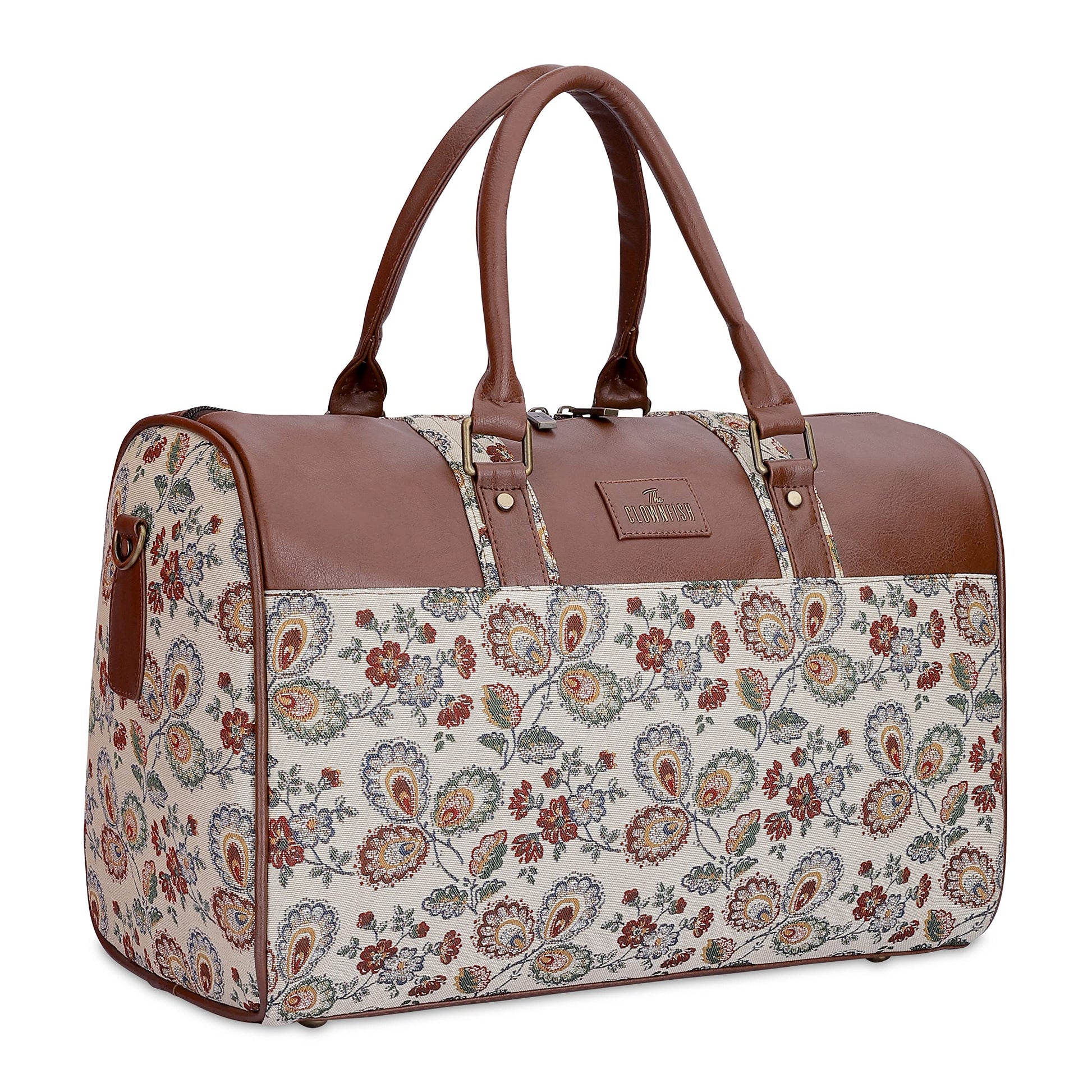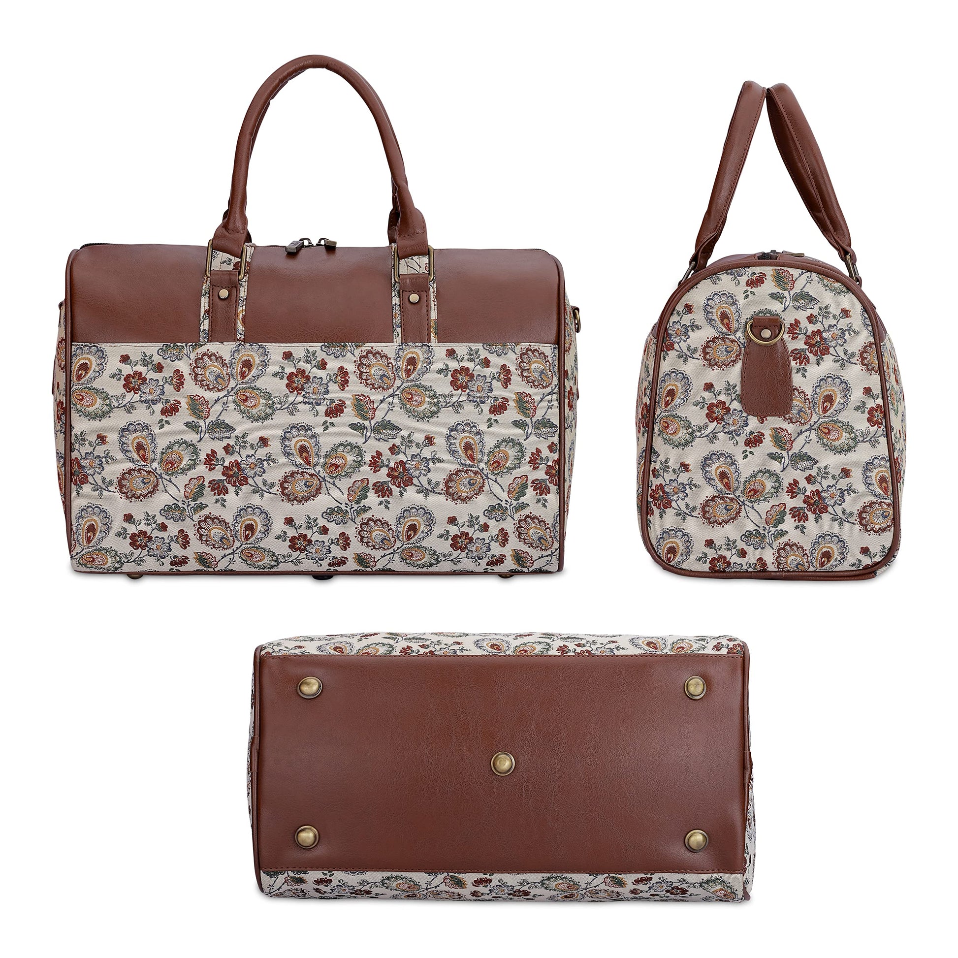 This stylish duffel bag is made of combination of Tapestry with Faux leather. For the inner lining soft feel polyester fabric is used
