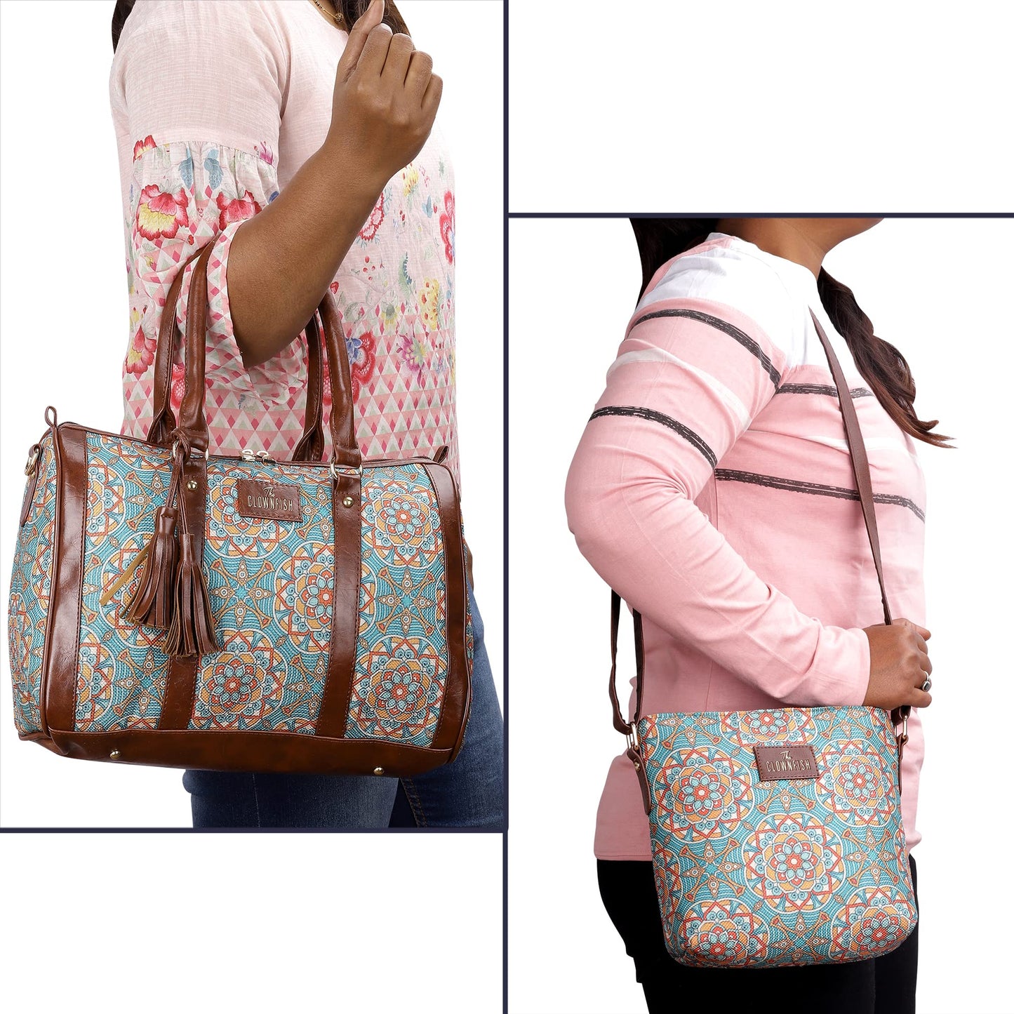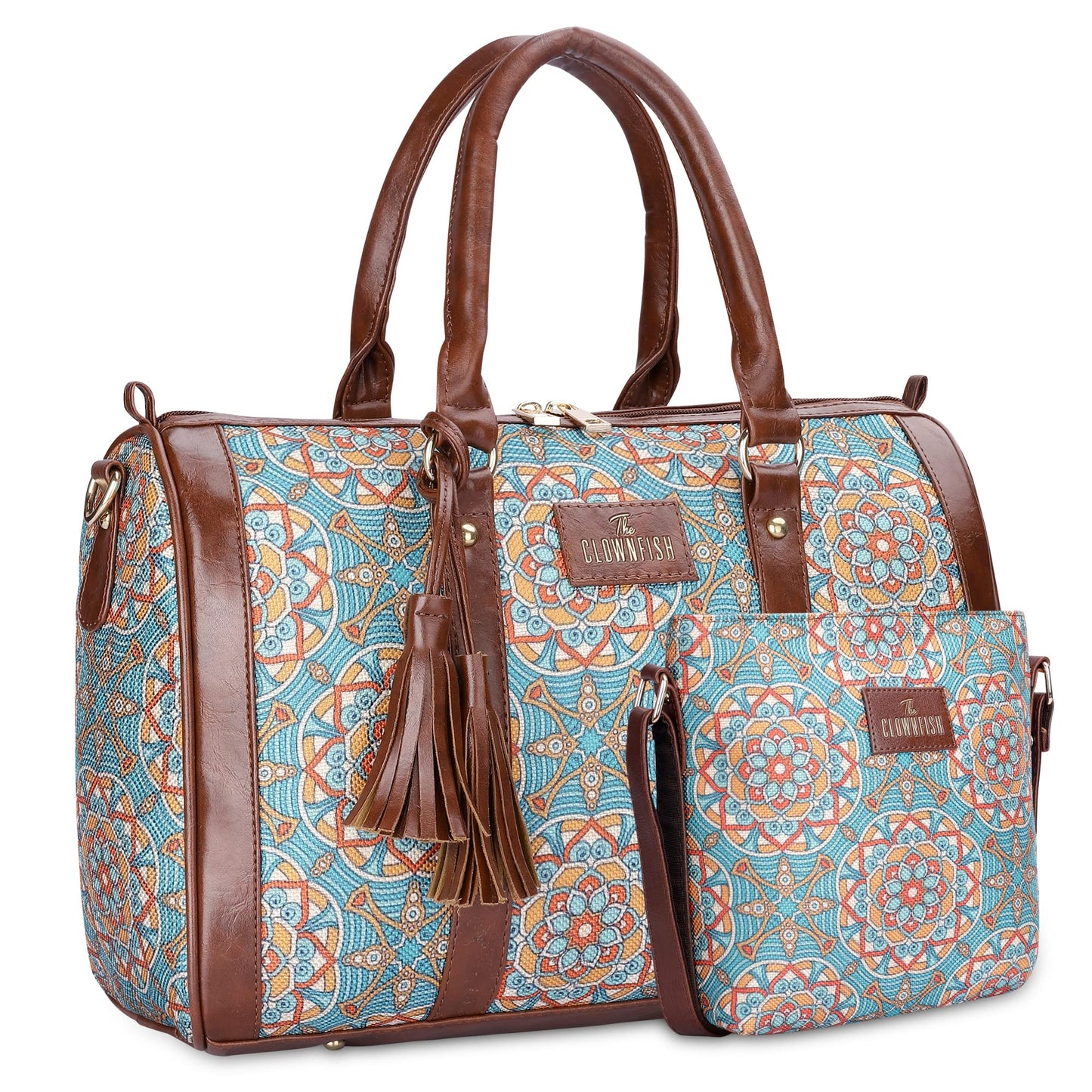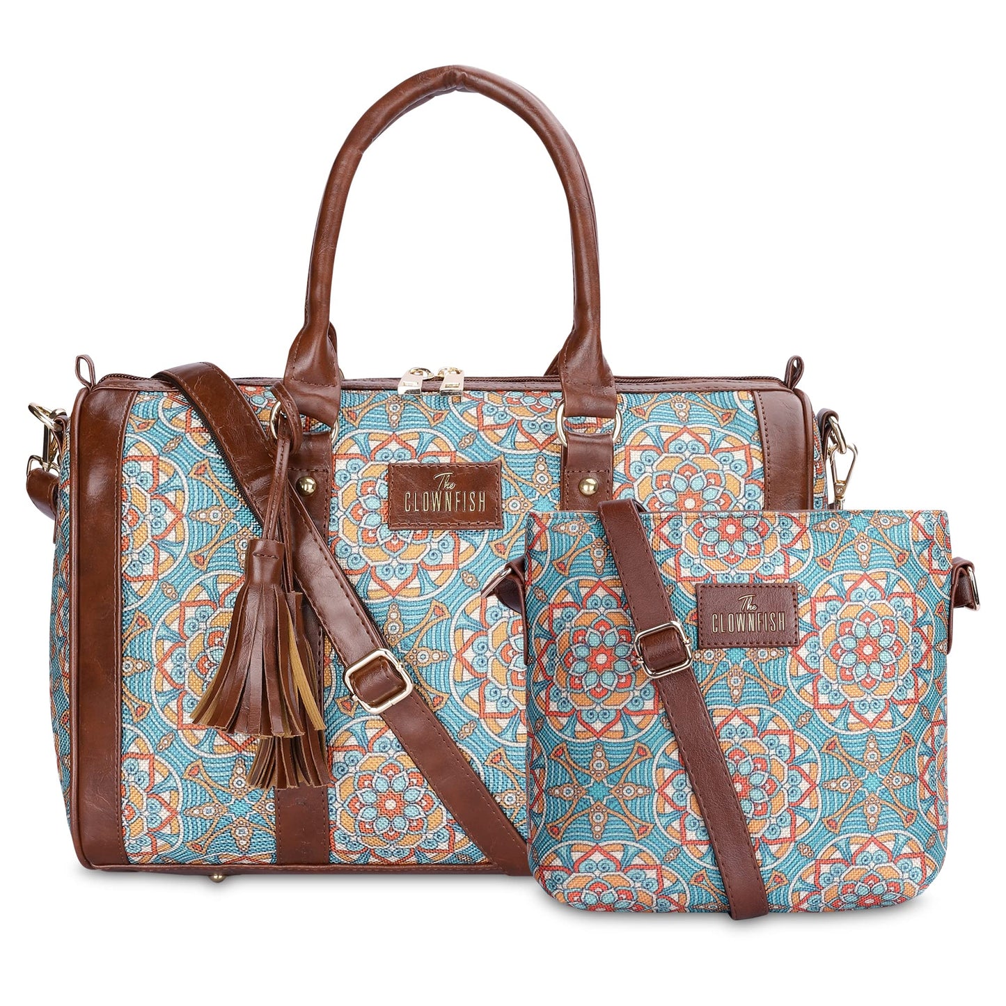 Introducing the ultimate accessory for the modern woman, the THE CLOWNFISH Combo featuring the Lorna Printed Handicraft Fabric & Faux Leather Handbag and the Aahna Printed Handicraft Fabric Crossbody Sling Bag. Designed with elegance and functionality in mind, this set is perfect for any occasion.