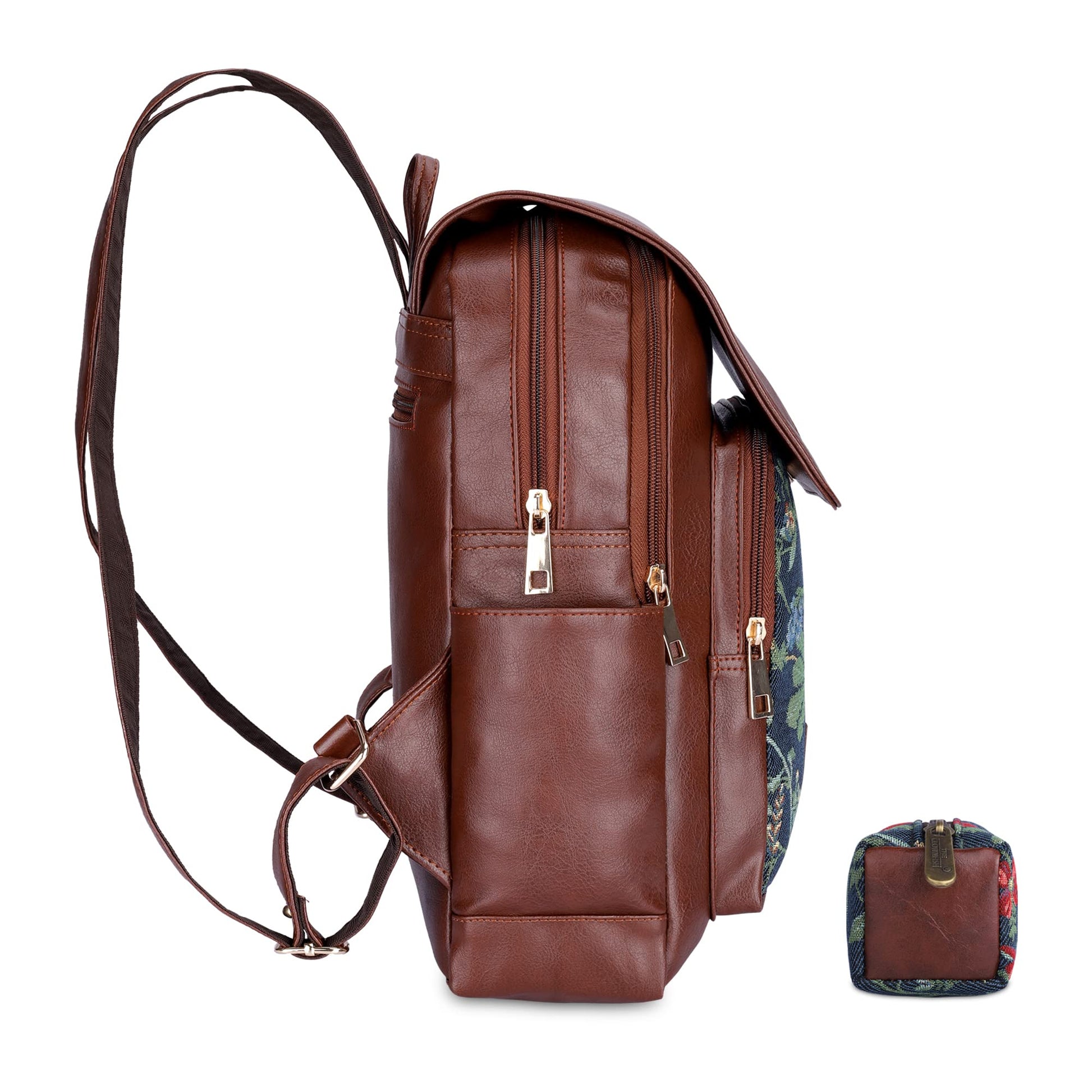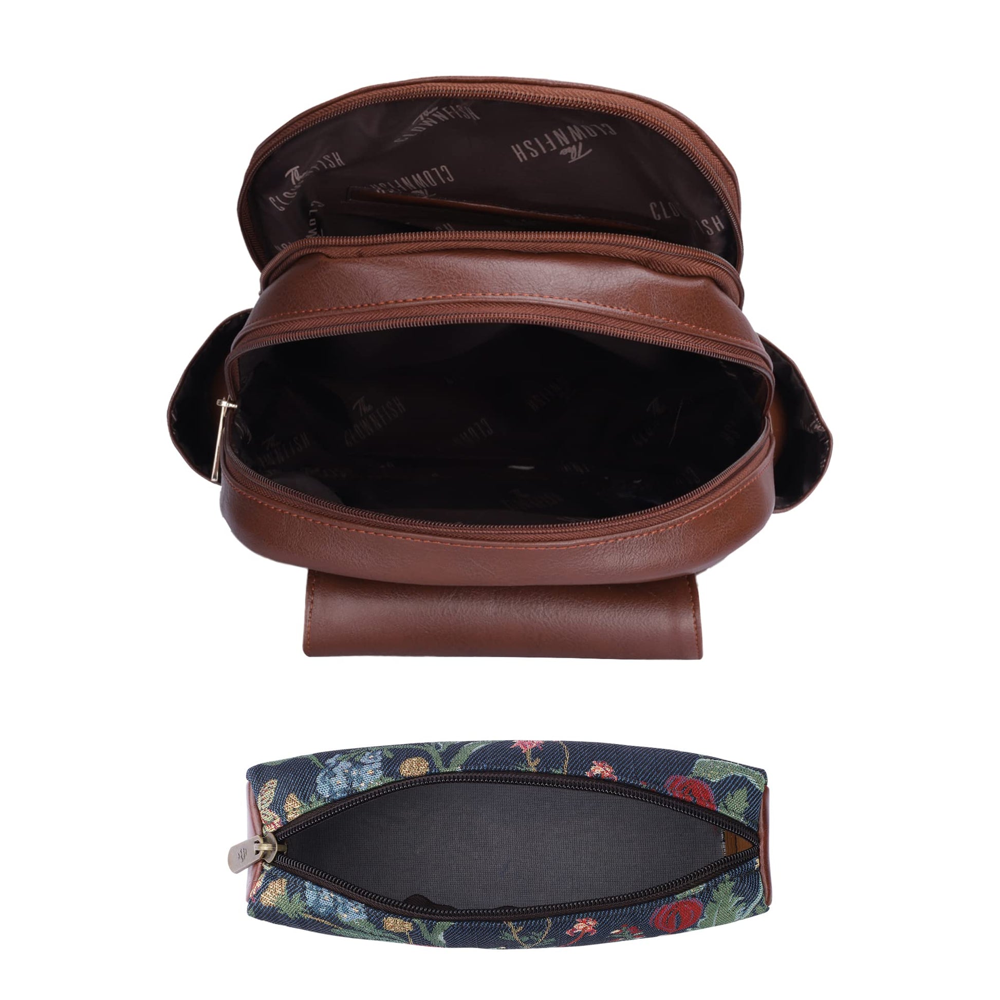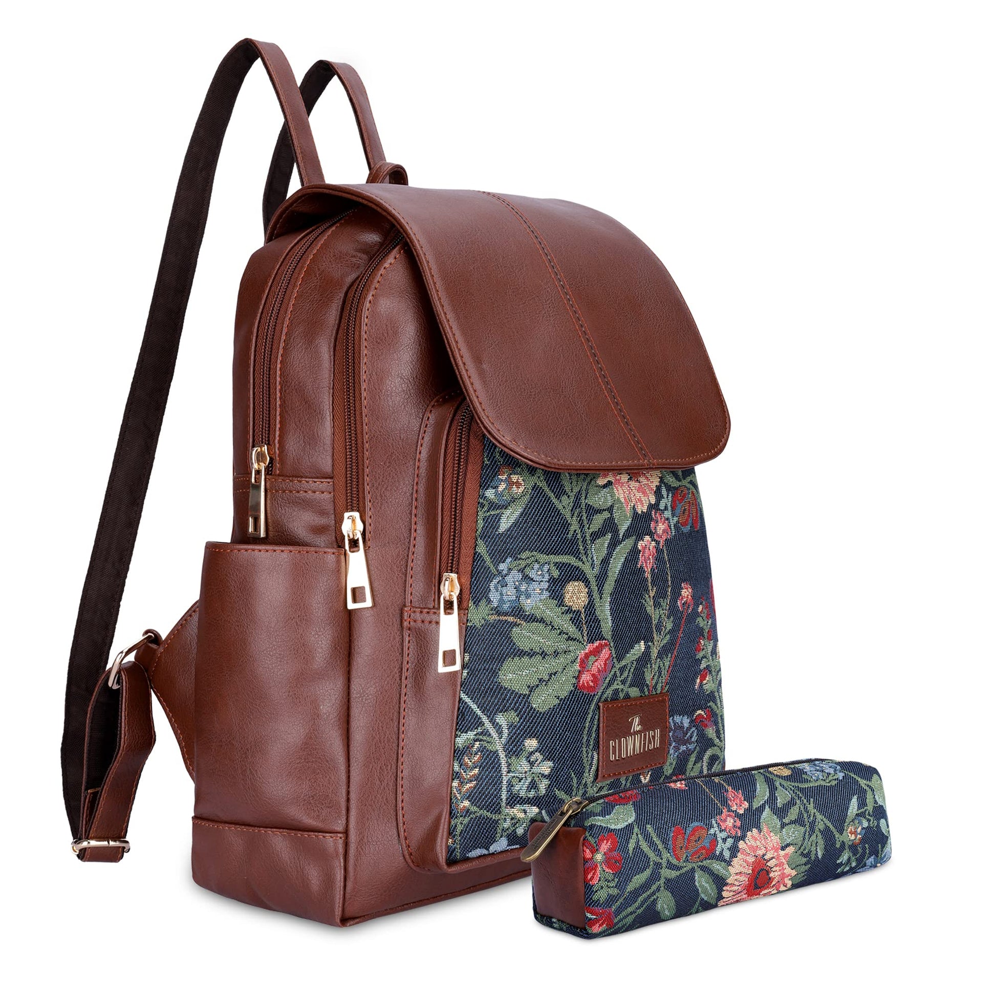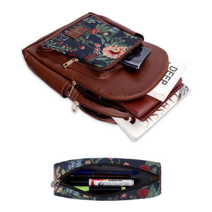 THE CLOWNFISH Combo Of Minerva Faux Leather & Tapestry Women's Backpack College School Girls Bag Casual Travel Backpack For Ladies & Expert Series Pencil Pouch Pen Case (Navy Blue-Floral), 10 Litres