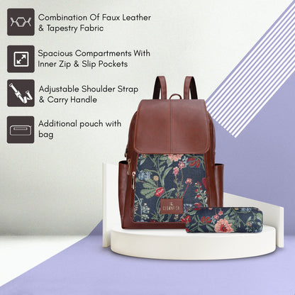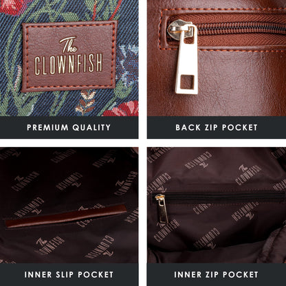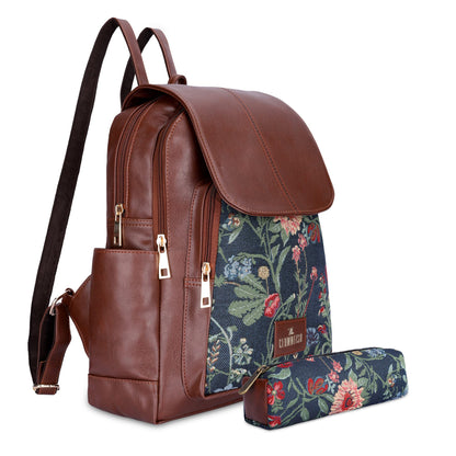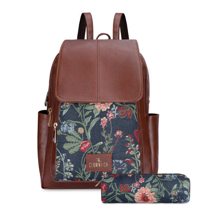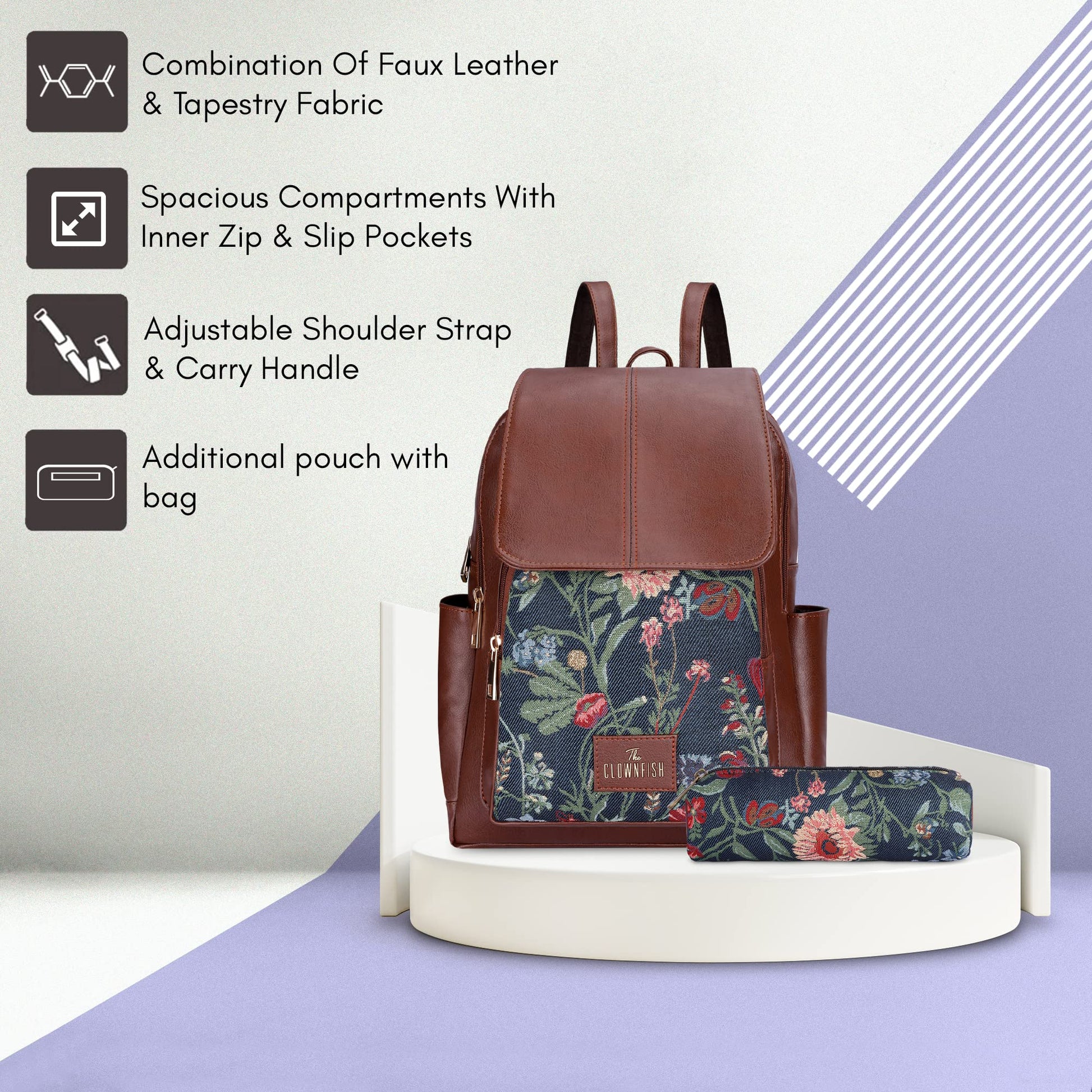 Elevate your everyday style with THE CLOWNFISH Combo of Minerva Faux Leather & Tapestry Women's Backpack and Expert Series Pencil Pouch. Designed with the modern woman in mind, this chic navy blue-floral combo is not just a backpack; it's your ultimate companion for college, travel, and everyday adventures.