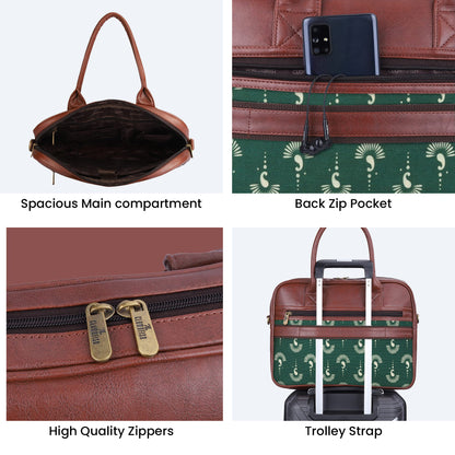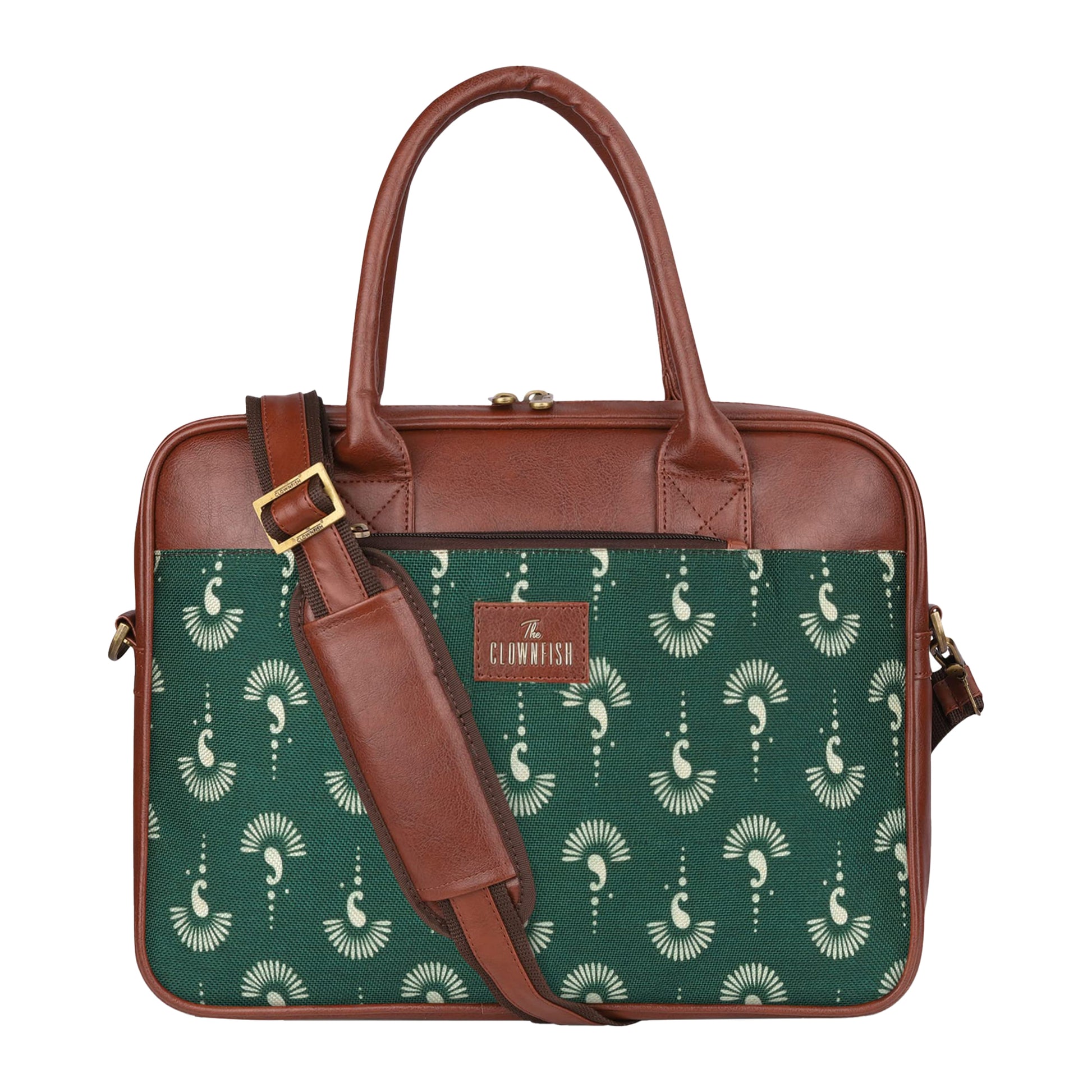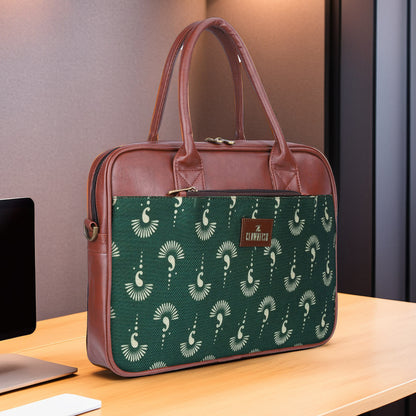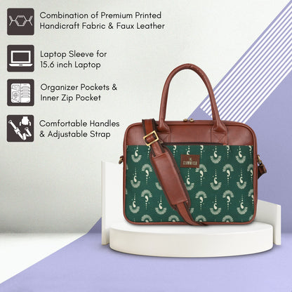 THE CLOWNFISH Deborah series 15.6 inch Laptop Bag For Women Printed Handicraft Fabric & Faux Leather Office Bag Briefcase Messenger Sling Handbag Business Bag (Bottle Green)
