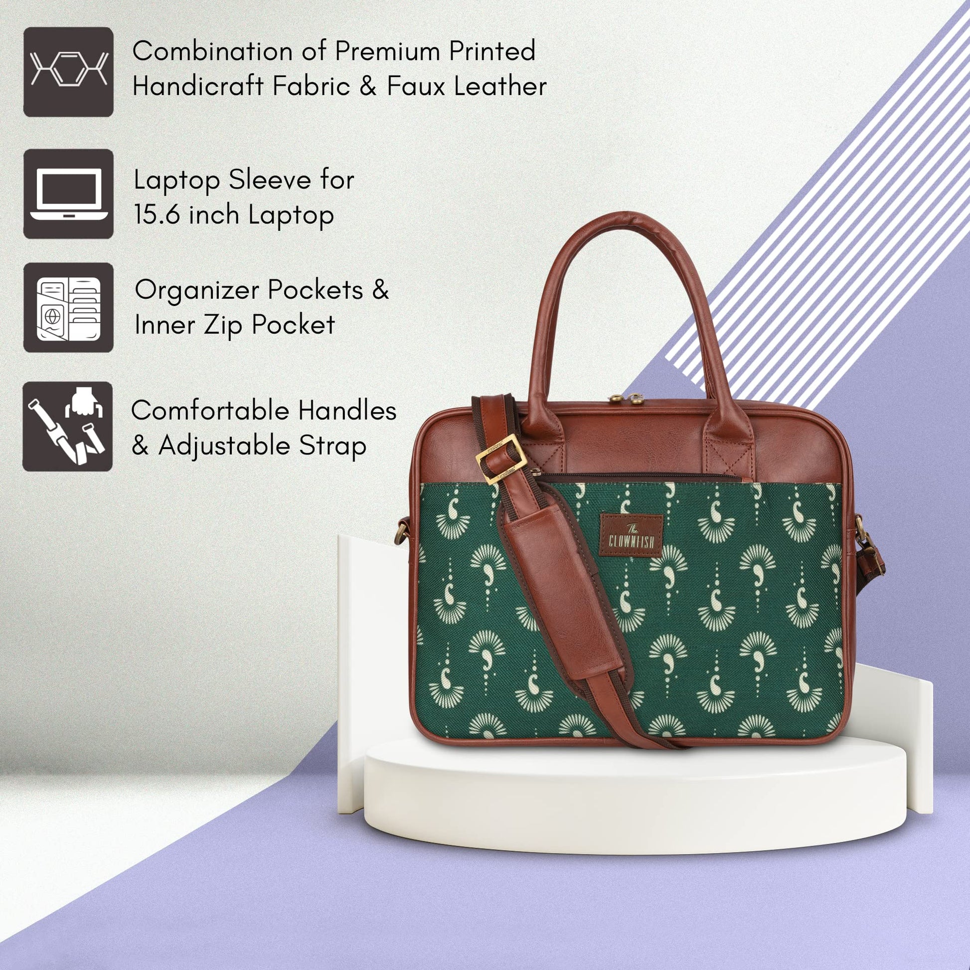 Introducing THE CLOWNFISH Deborah series 15.6 inch Laptop Bag, expertly crafted for the modern woman on the go. This chic and functional bag combines the elegance of printed handicraft fabric with the sophistication of faux leather, making it the perfect accessory for any office environment.