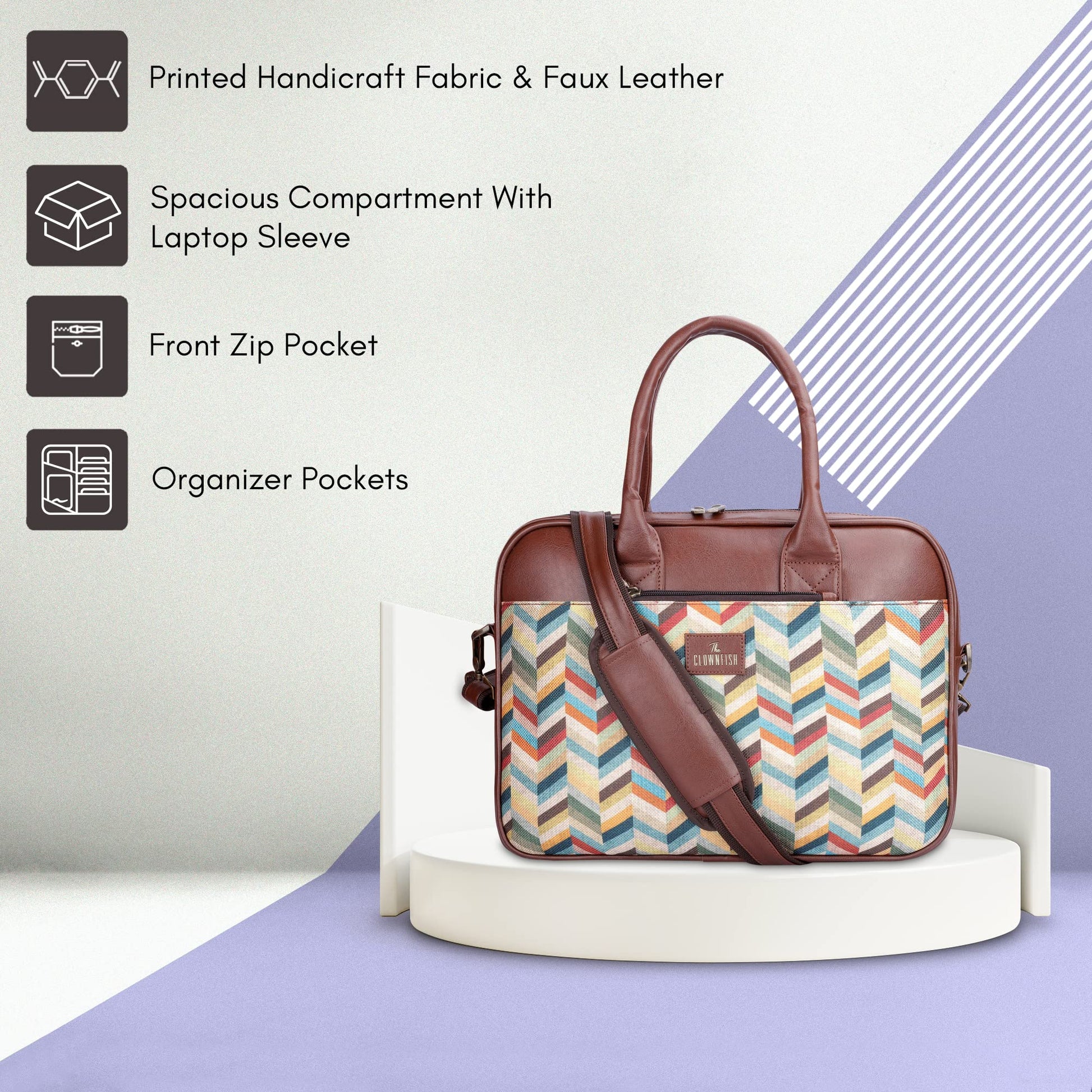The CLOWNFISH Deborah Series 15.6 inch Laptop Bag for Women is not just a bag; it's a statement piece designed for the modern professional. Crafted from a stunning combination of premium Printed Handicraft Fabric and Faux Leather, this bag showcases a vibrant multicolour-rainbow design that stands out in any setting.