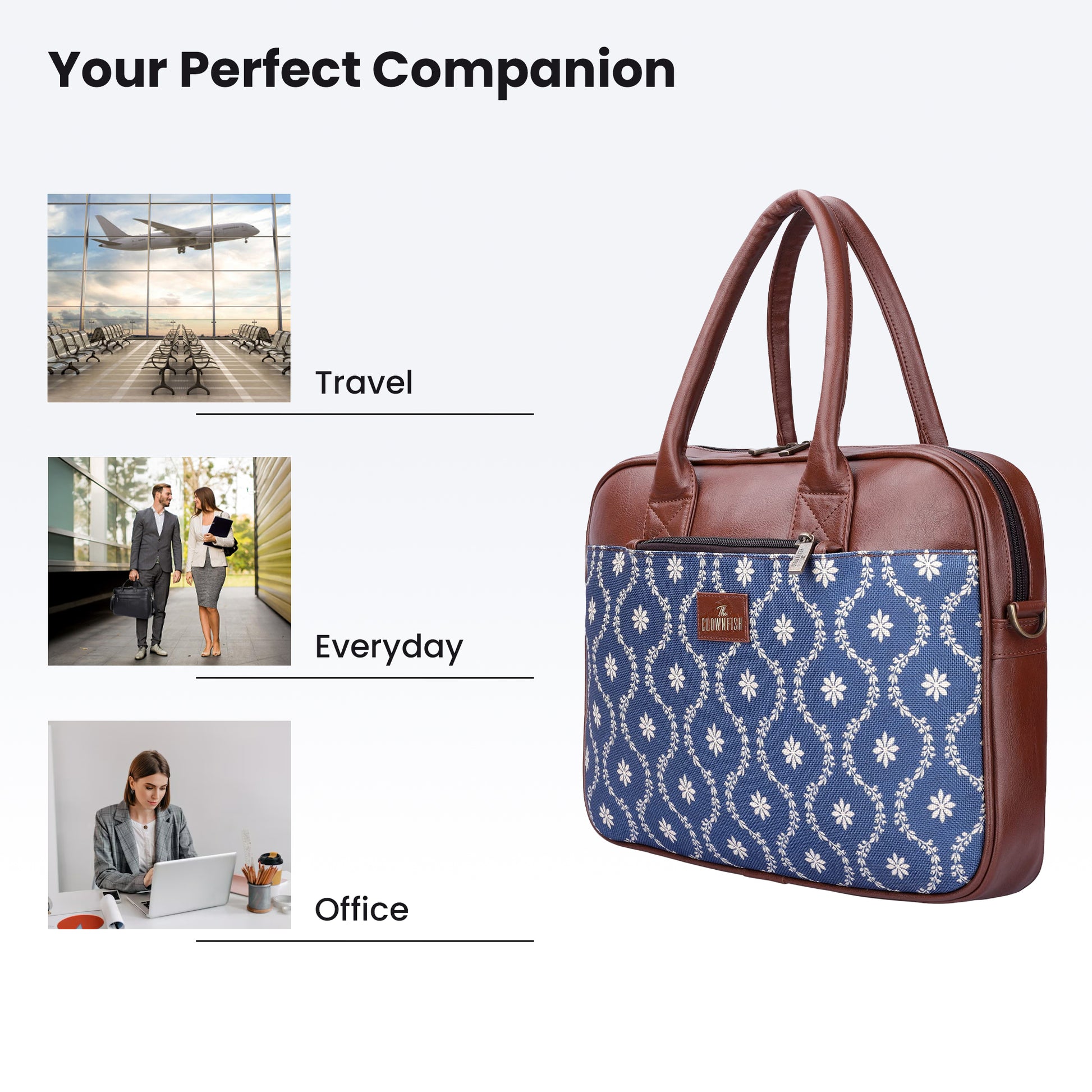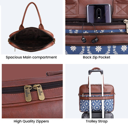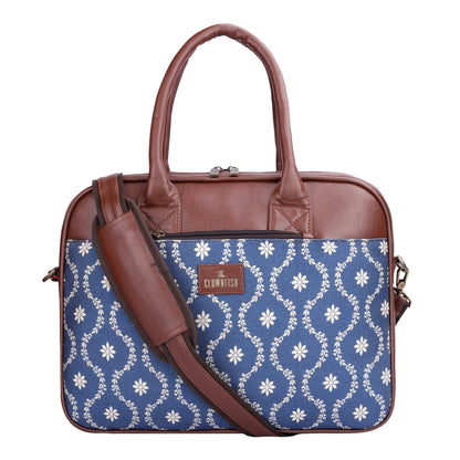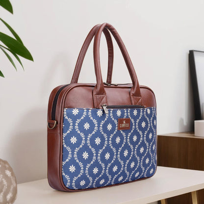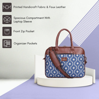 Deborah 15.6 inch Laptop Bag - Printed Handicraft Fabric & Faux Leather | 4 Pockets | Royal Blue
