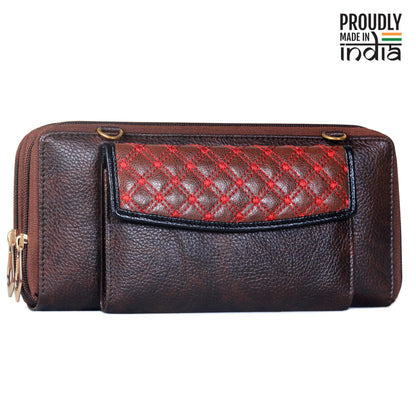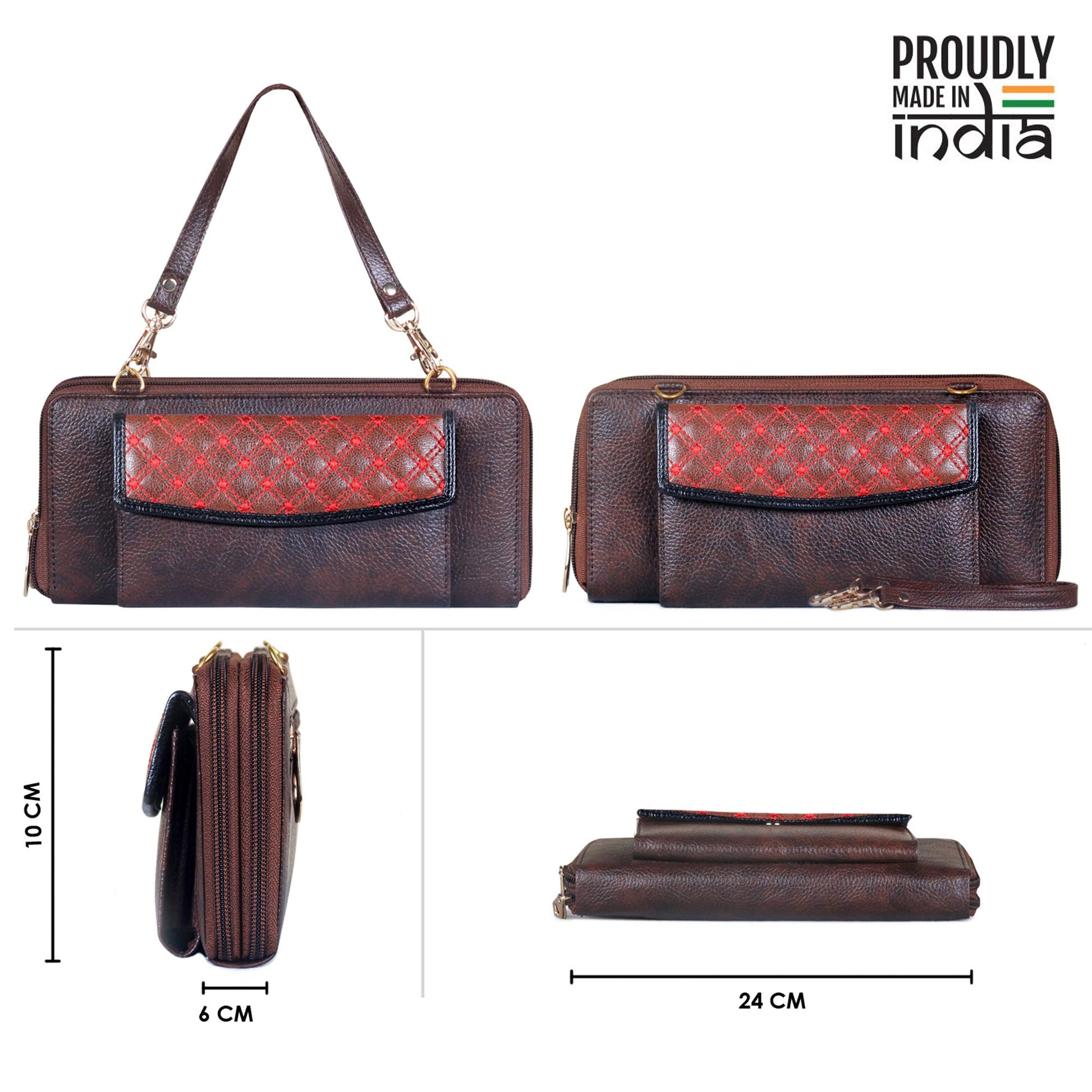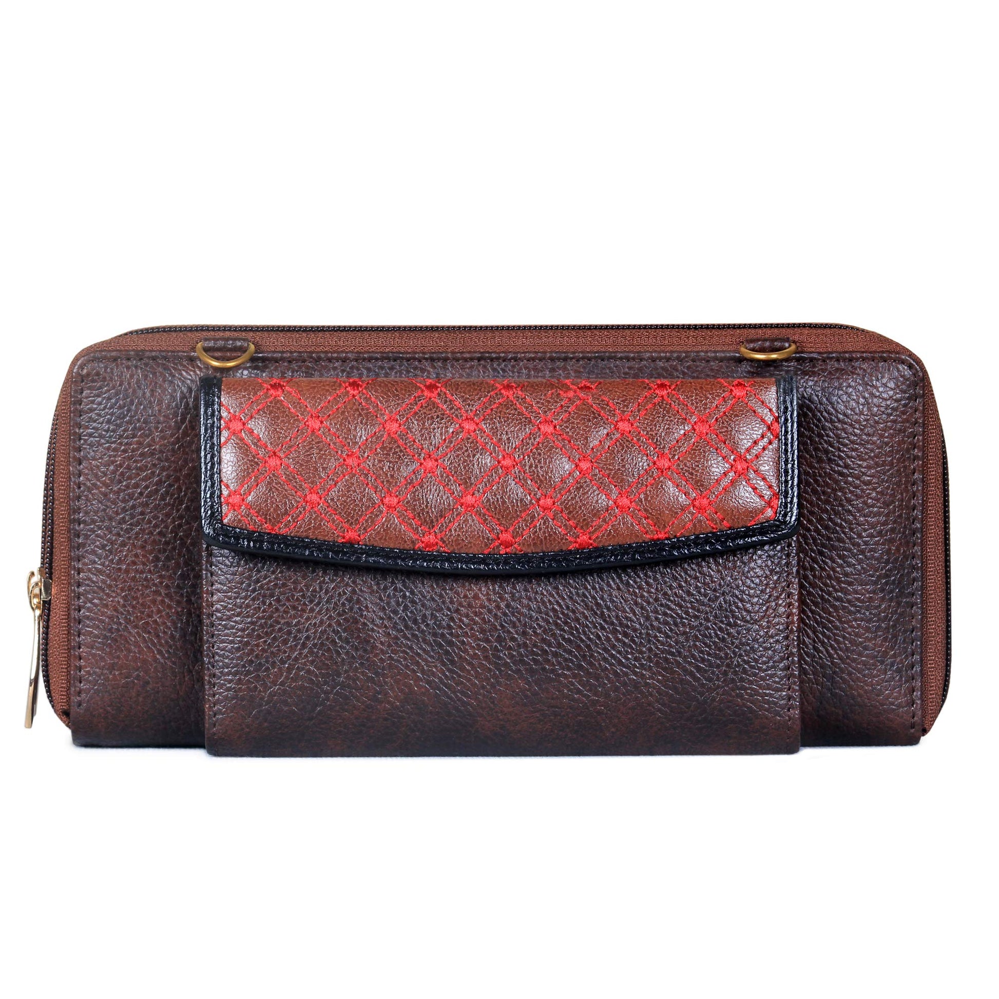 Introducing the THE CLOWNFISH Diamond Womens Wallet by Clownfish, your perfect accessory for every occasion. Expertly crafted from premium vegan leather, this wallet features a chic dark brown color with stunning red checkered embroidery on the front mobile pocket flap. Designed for convenience, it includes two main compartments alongside multiple pockets and card slots, allowing you to store cash, bills, and cards effortlessly. Its compact size makes it ideal for travel while keeping your valuables secure with a stylish snap flap closure.