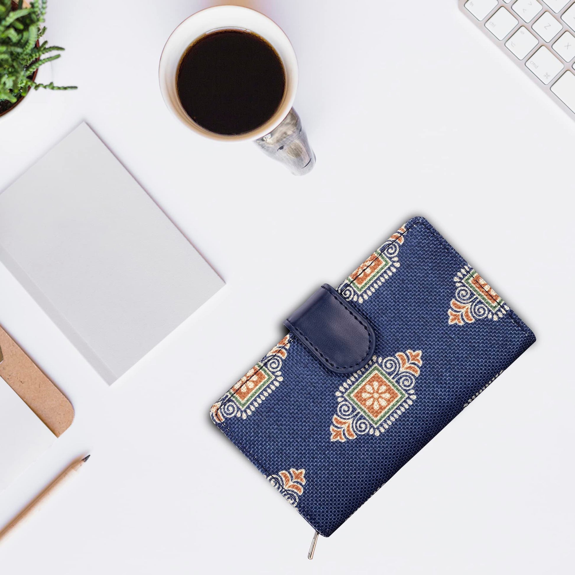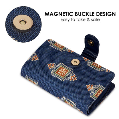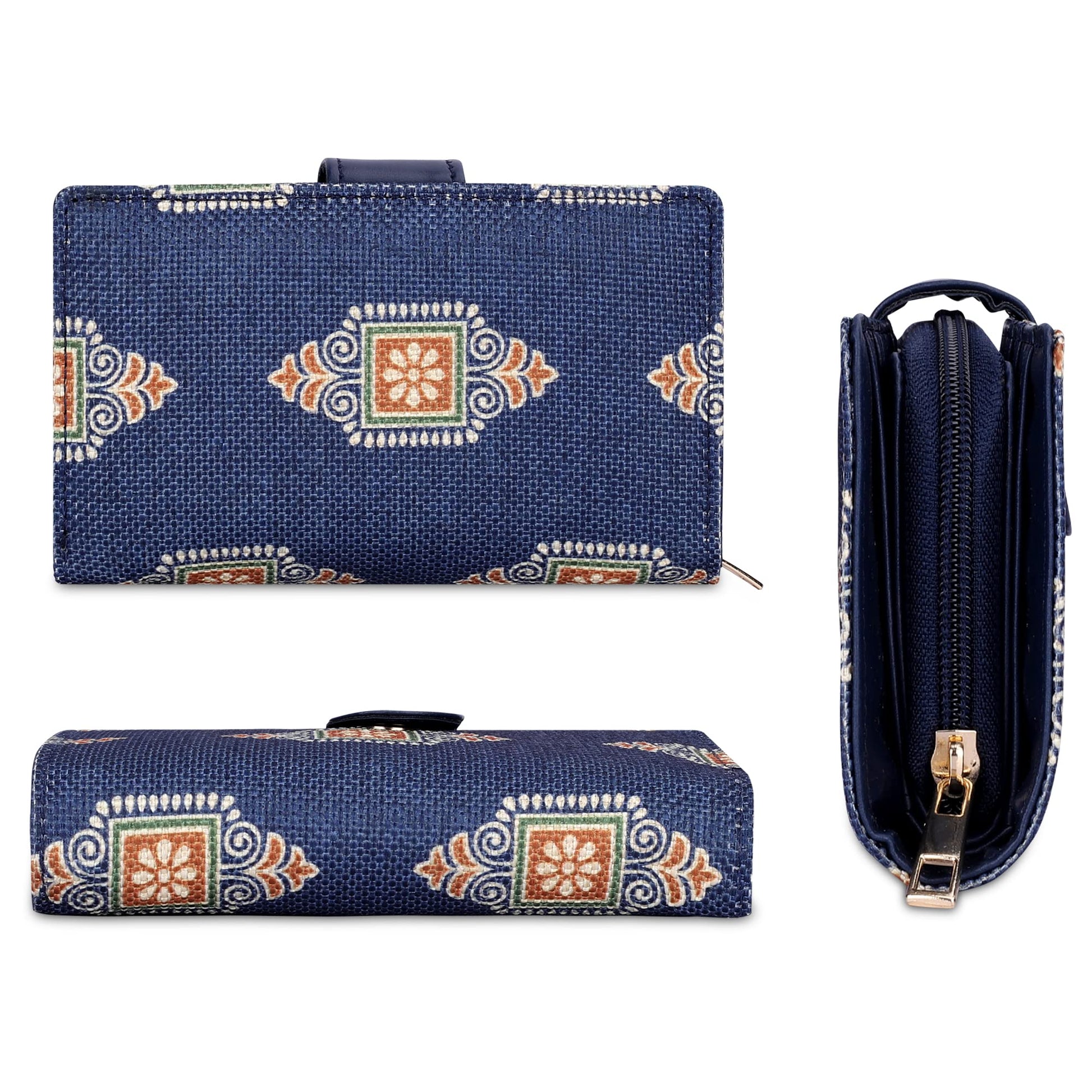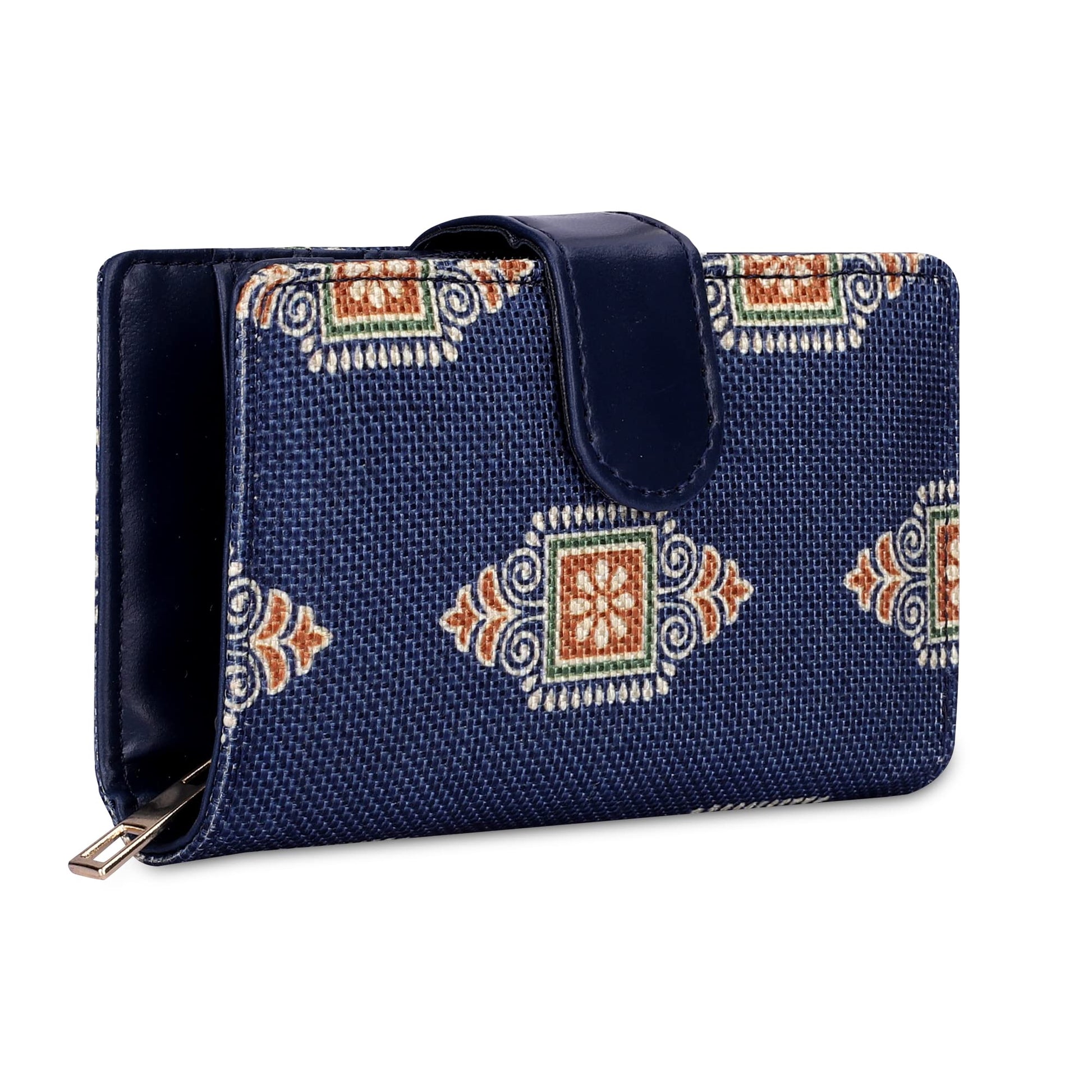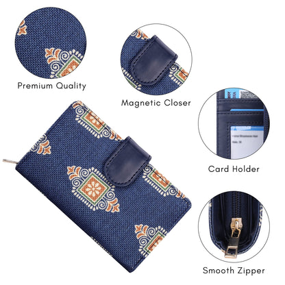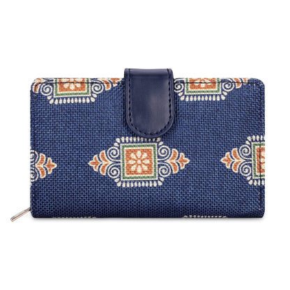 THE CLOWNFISH Fab Series Printed Handicraft Fabric & Vegan Leather Ladies Wallet Clutch Purse for Women Girls with Multiple Compartments (Dark Blue)