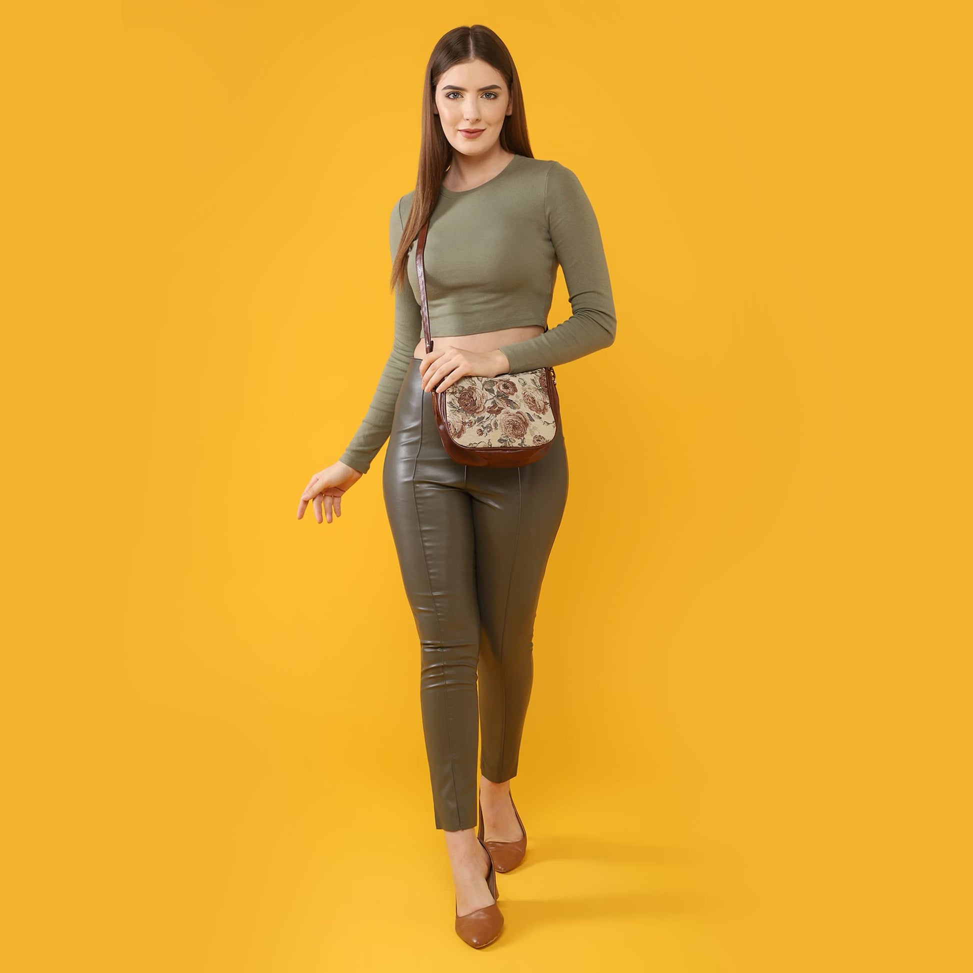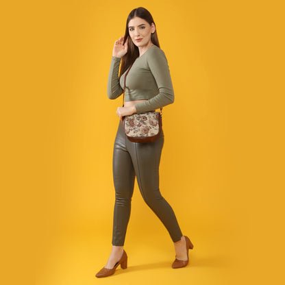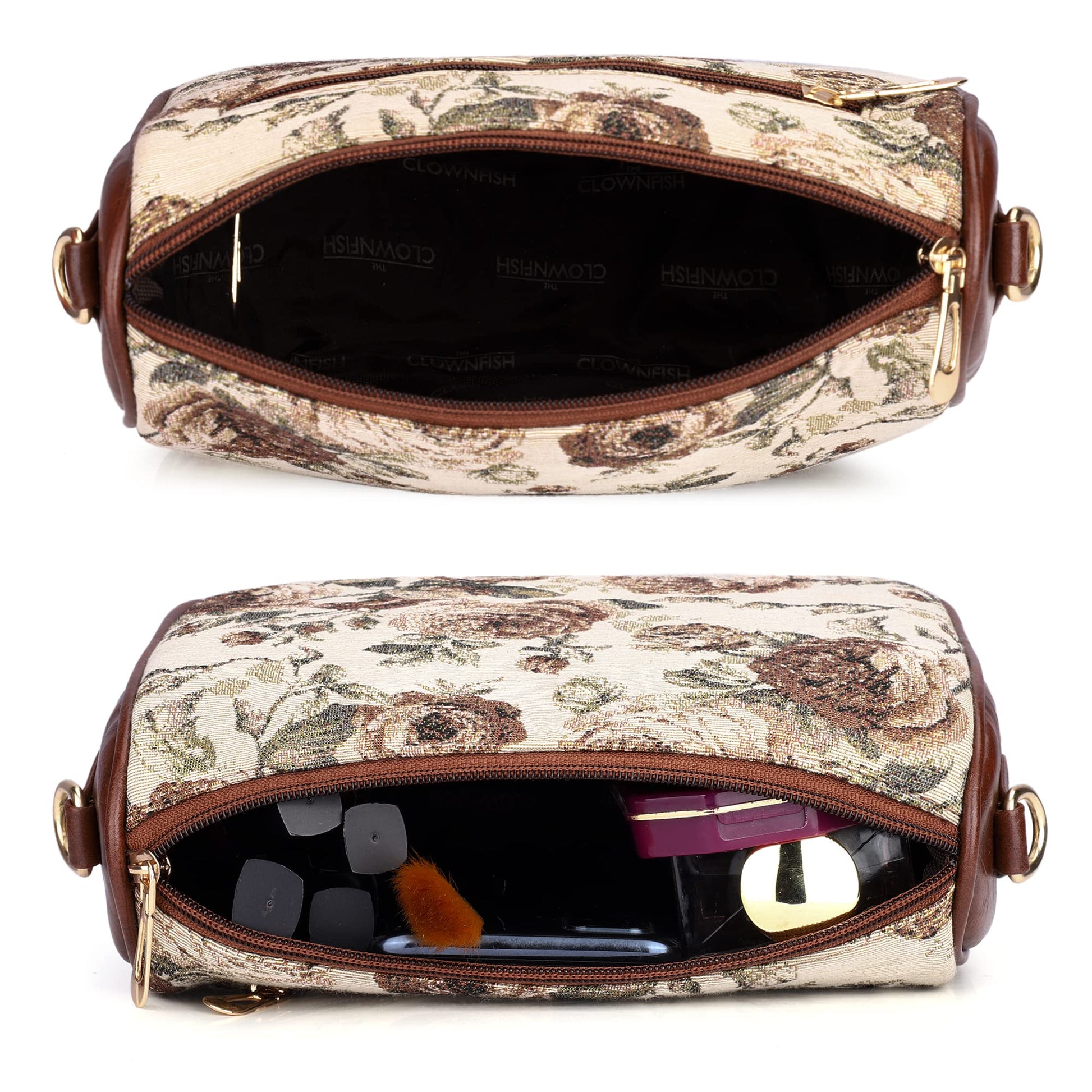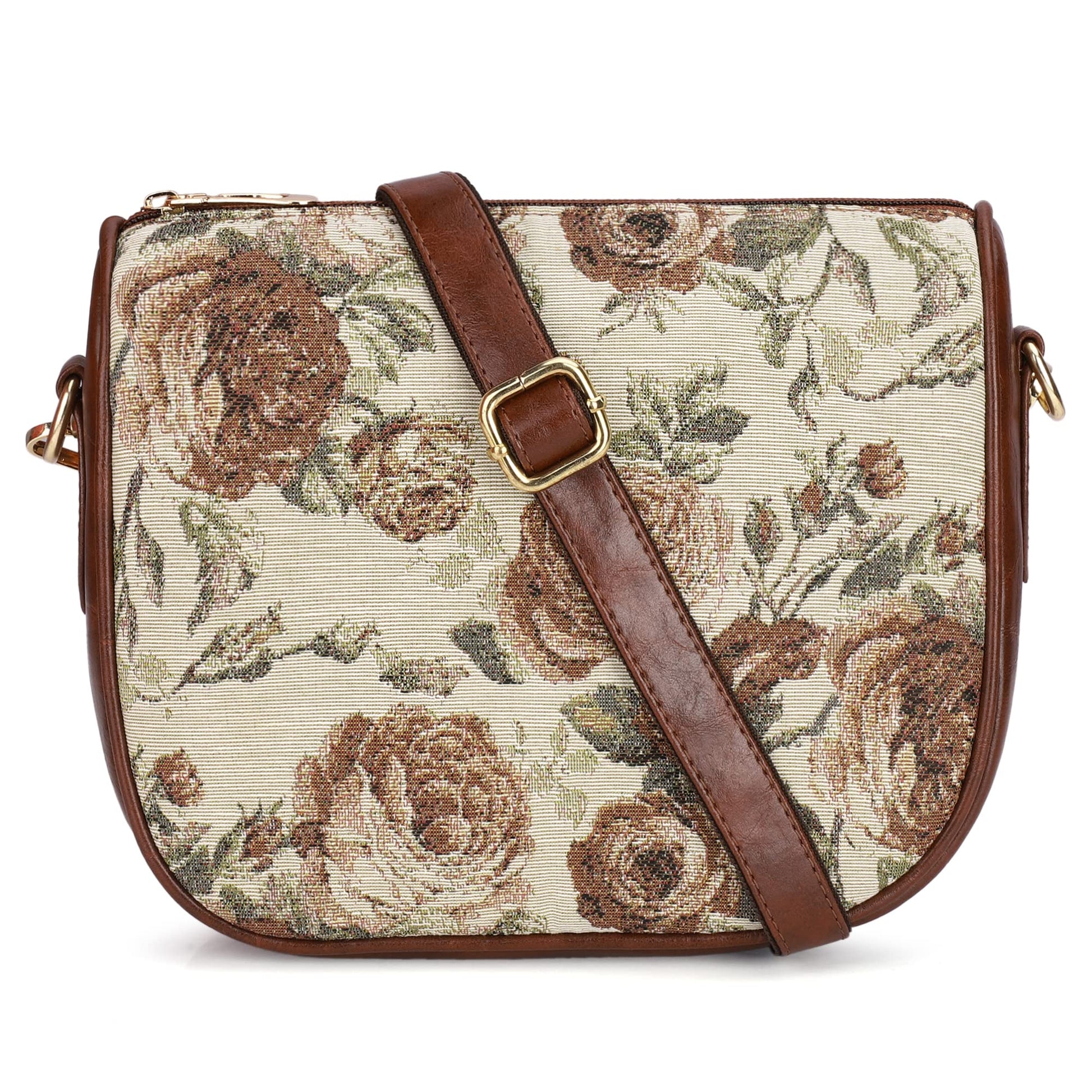 THE CLOWNFISH Garnet Series Printed Handicraft Fabric & Tapestry Crossbody Sling Bag for Women Ladies Single Shoulder Bag Shoulder Belt (Brown-Floral)