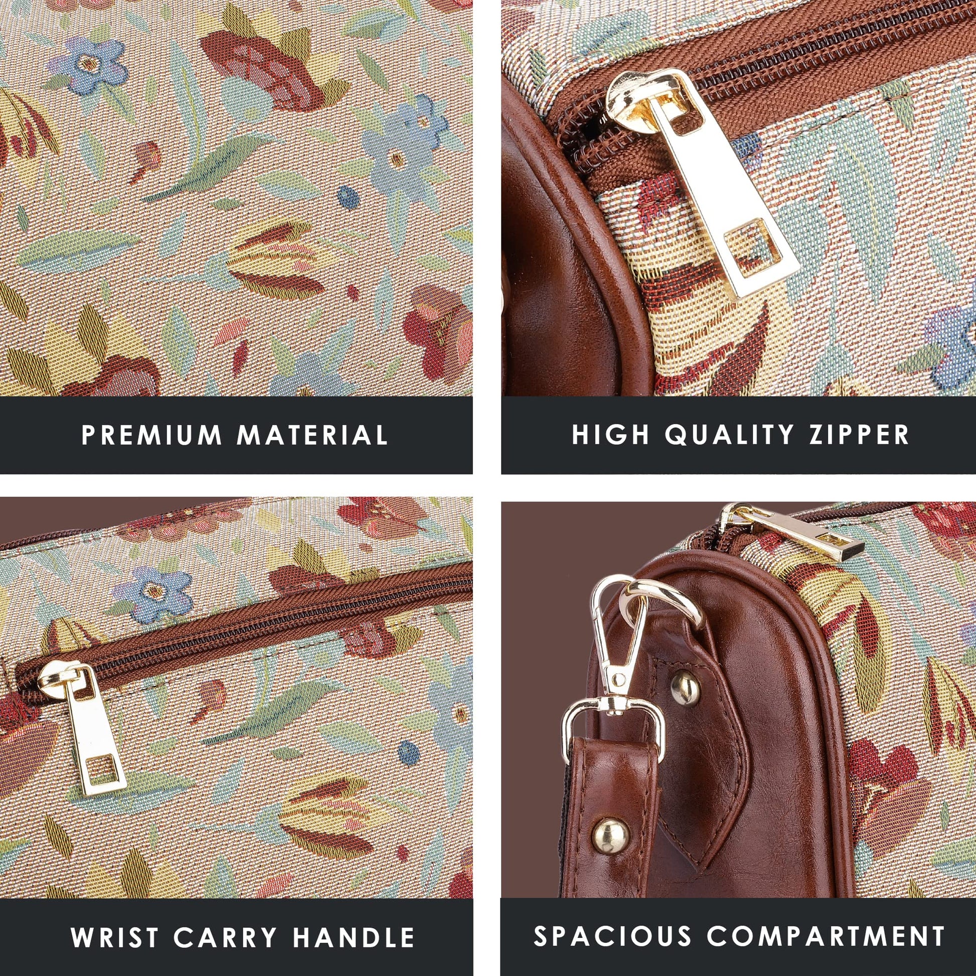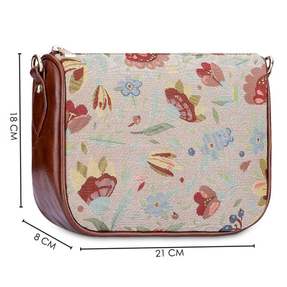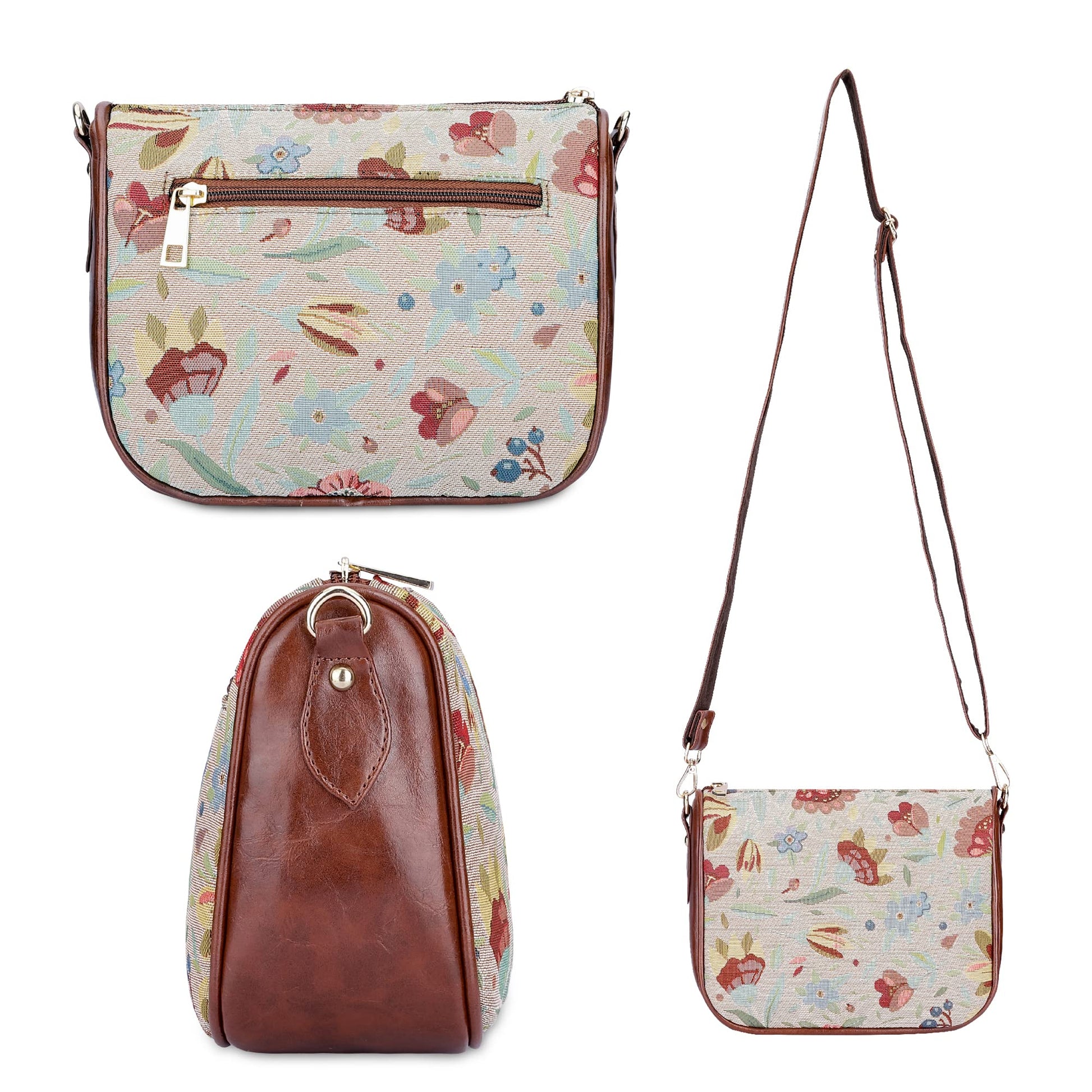This sling bag is crafted from a high-quality combination of Tapestry and Faux Leather, ensuring a luxurious look while maintaining durability. The inner lining is made of soft, premium-quality polyester fabric that adds to the overall comfort. With sturdy reinforced fittings, including robust metal zippers and buckles, this bag is built to last.