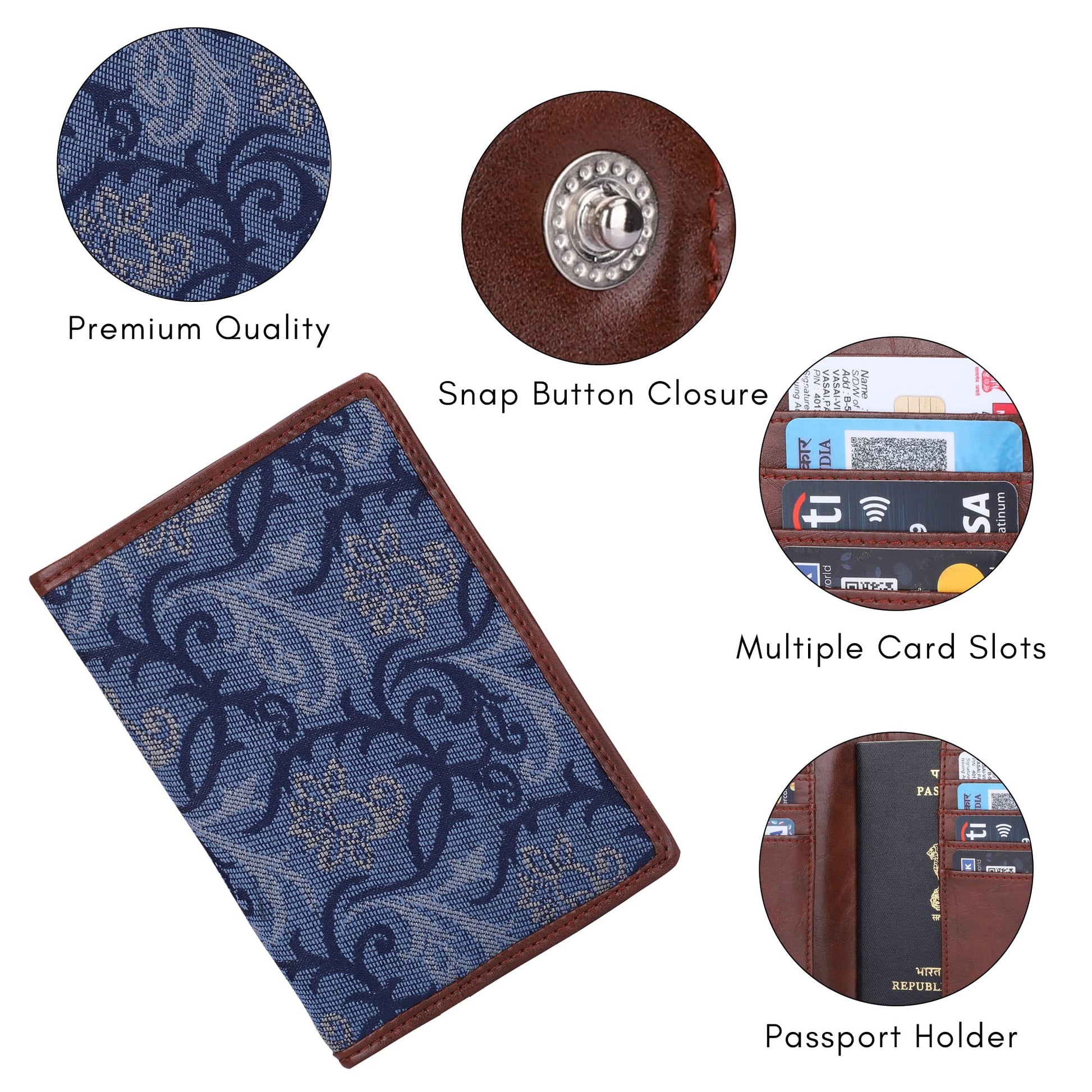 Introducing THE CLOWNFISH Glamour Fold Series Tapestry Fabric & Faux Leather Unisex Passport Wallet in the exquisite Blue-Spade Design. This passport wallet is not just a travel accessory; it's a stylish and functional organizer designed for the modern traveler.