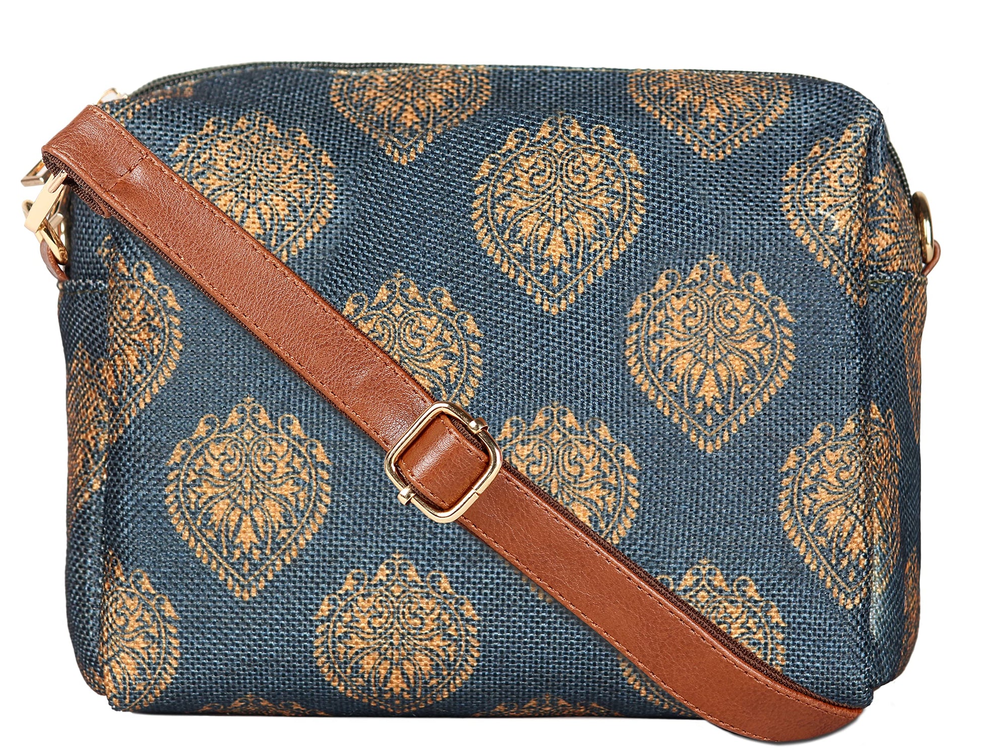 The Isla Printed Handicraft Fabric Crossbody Sling Bag for Women Casual Party Bag Purse with Adjustable Shoulder Strap and Printed Design for Ladies College Girls (Peacock Blue)
