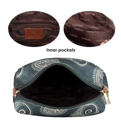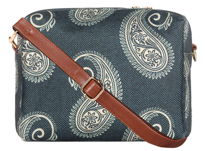 Introducing THE CLOWNFISH Isla Printed Handicraft Fabric Crossbody Sling Bag, designed for the modern woman who appreciates both aesthetics and practicality. This sling bag, embellished with a light green geometric design, is the ideal accessory for casual outings, parties, or daily travel.