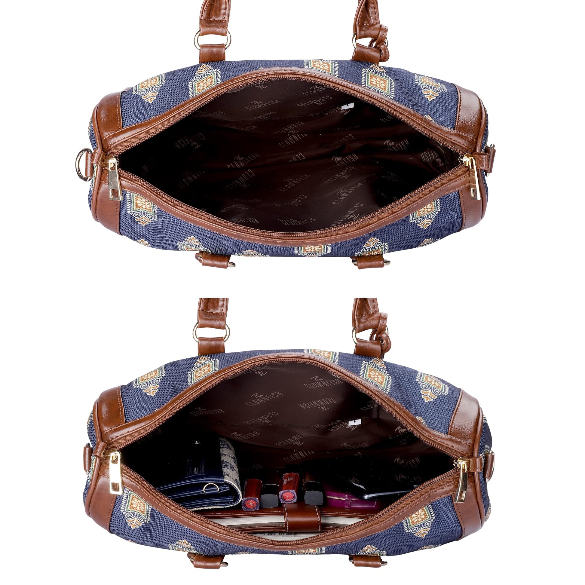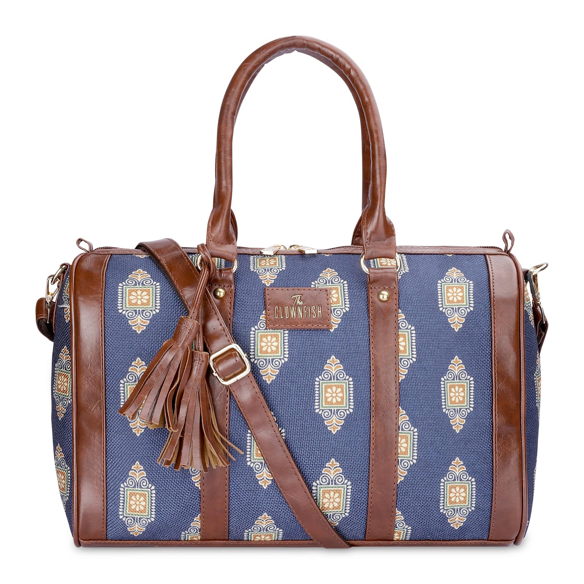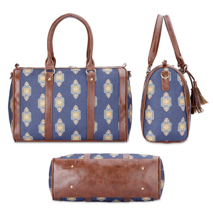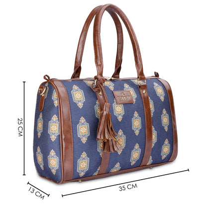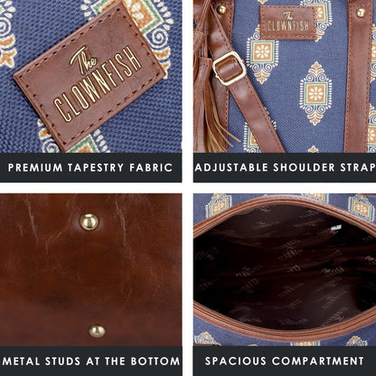 THE CLOWNFISH Lorna Printed Handicraft Fabric & Faux Leather Handbag Sling Bag for Women Office Bag Ladies Shoulder Bag Tote For Women College Girls (Dark Blue)