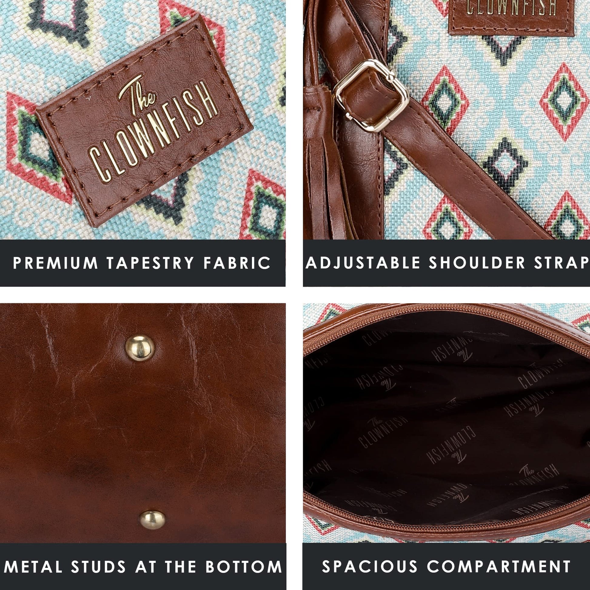 THE CLOWNFISH Lorna Printed Handicraft Fabric & Faux Leather Handbag Sling Bag for Women Office Bag Ladies Shoulder Bag Tote For Women College Girls (Sky Blue-Diamond)