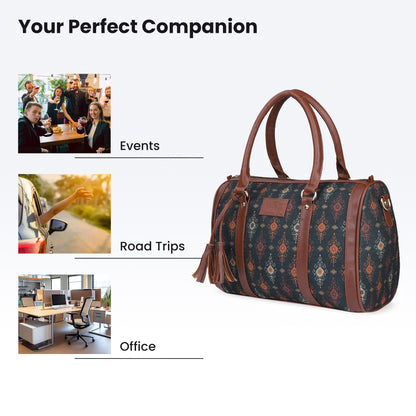Crafted from a combination of high-quality Printed Handicraft Fabric and durable Faux Leather, this handbag is built to last. The soft-feel polyester lining ensures your belongings are protected, while reinforced fittings like metal zippers and sturdy double handles provide added strength and reliability.