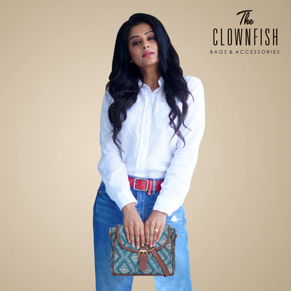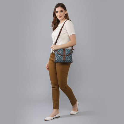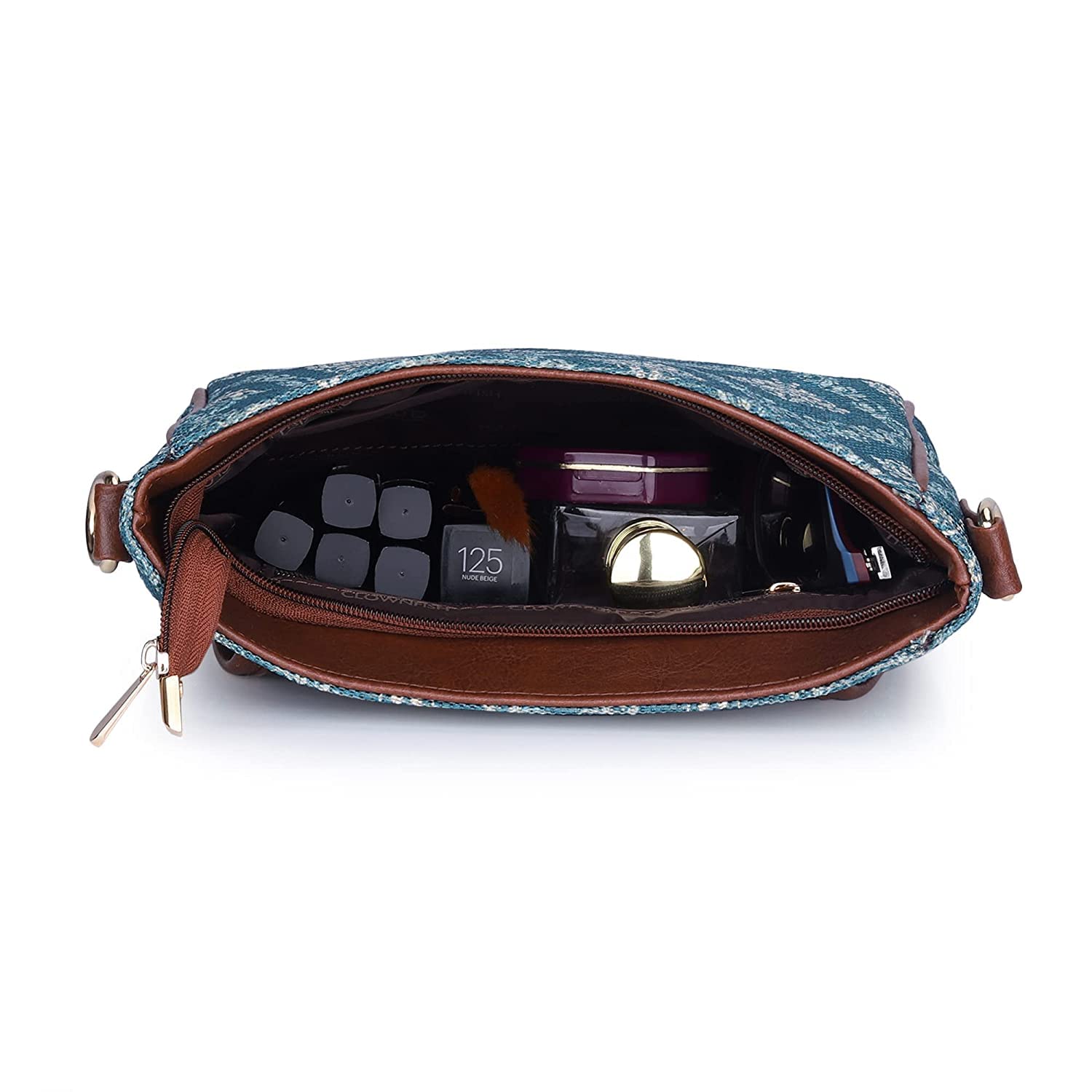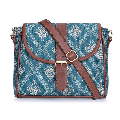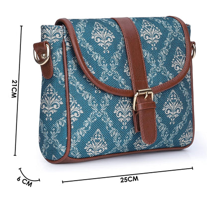 THE CLOWNFISH Madeline Printed Handicraft Fabric Handbag for Women Crossbody Sling Bag Office Bag Ladies Shoulder Bag with Snap Flap Closure & Shoulder Belt For Women College Girls (Blue)