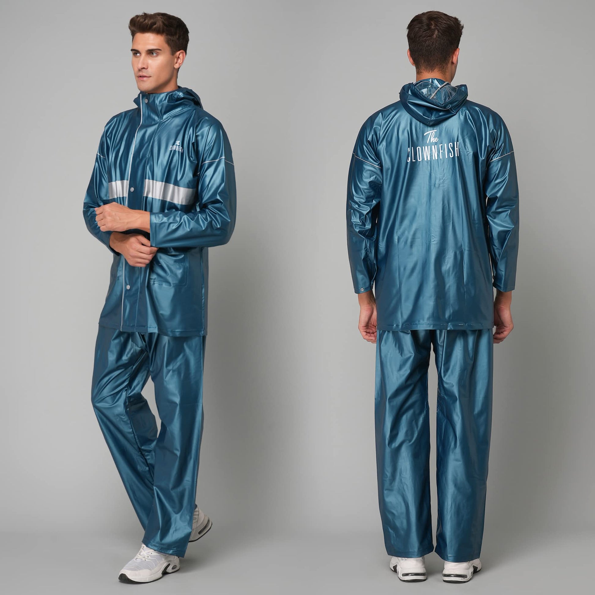 Introducing the Men's Waterproof Reversible Polyester Raincoat by Clownfish, a must-have for every man’s wardrobe. This X-Large raincoat is crafted from premium waterproof PVC material, ensuring that you remain dry while looking great. It features a bright turquoise color and comes with a printed plastic pouch for easy storage and transport, making it perfect for both casual outings and unexpected weather.