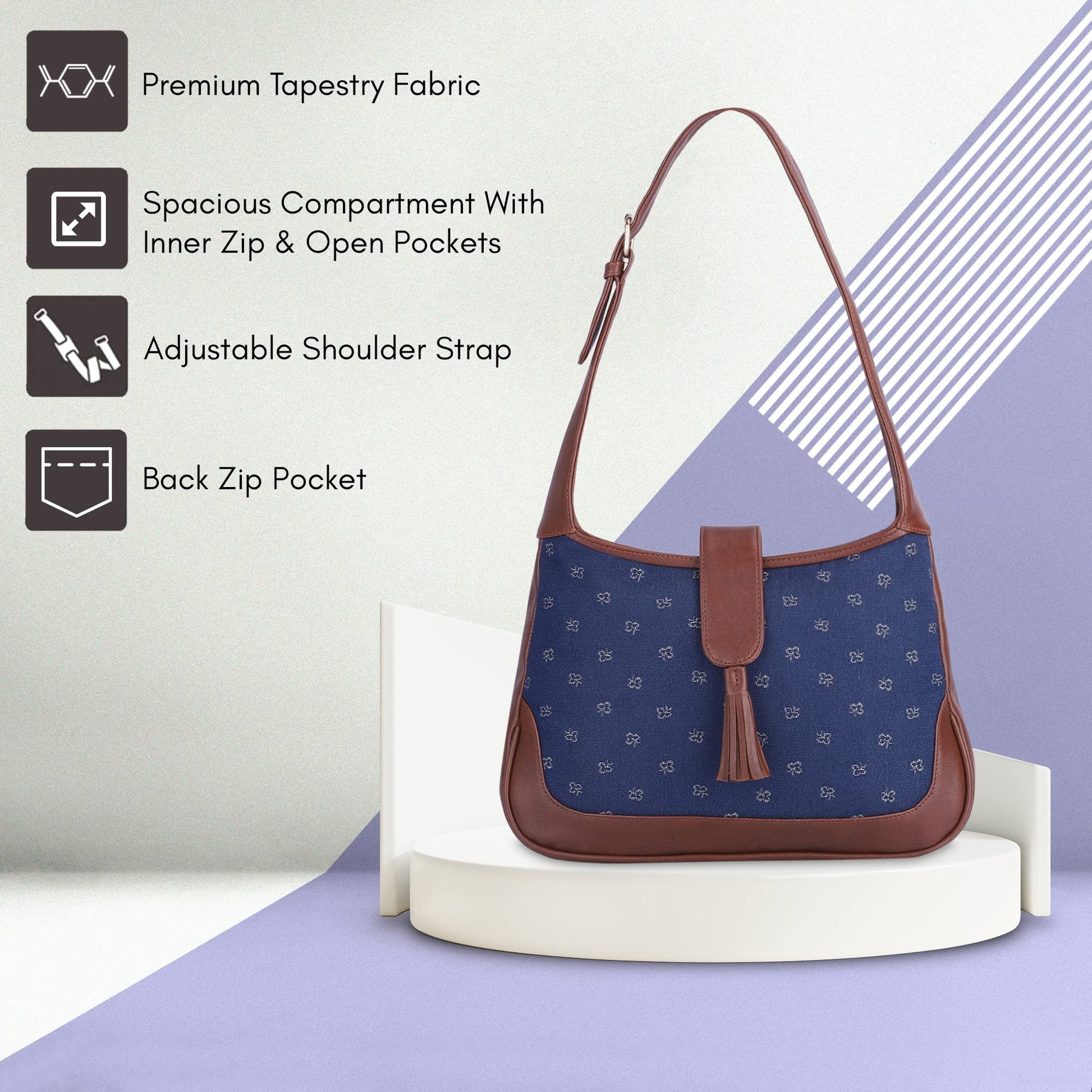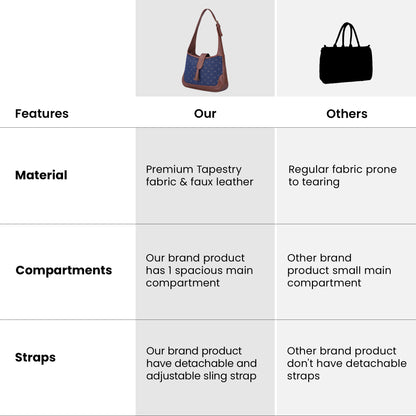 This handbag is made from combination of premium Tapestry fabric & faux leather. For the inner lining soft feel premium quality polyester fabric is used.