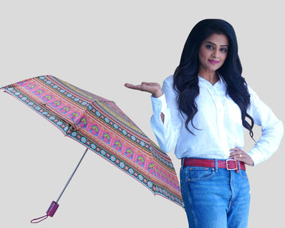 This 3- Fold umbrella features durable construction in metal frame with ribs for added strength.