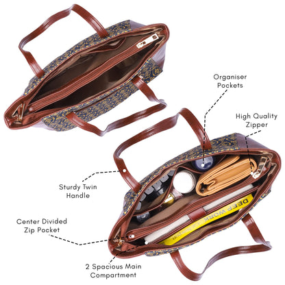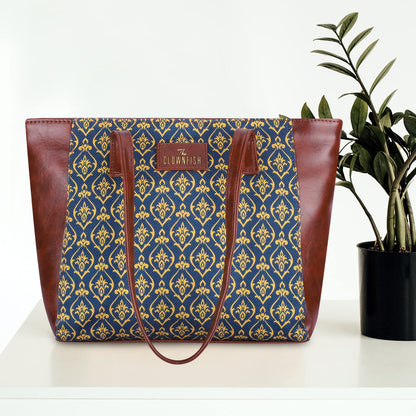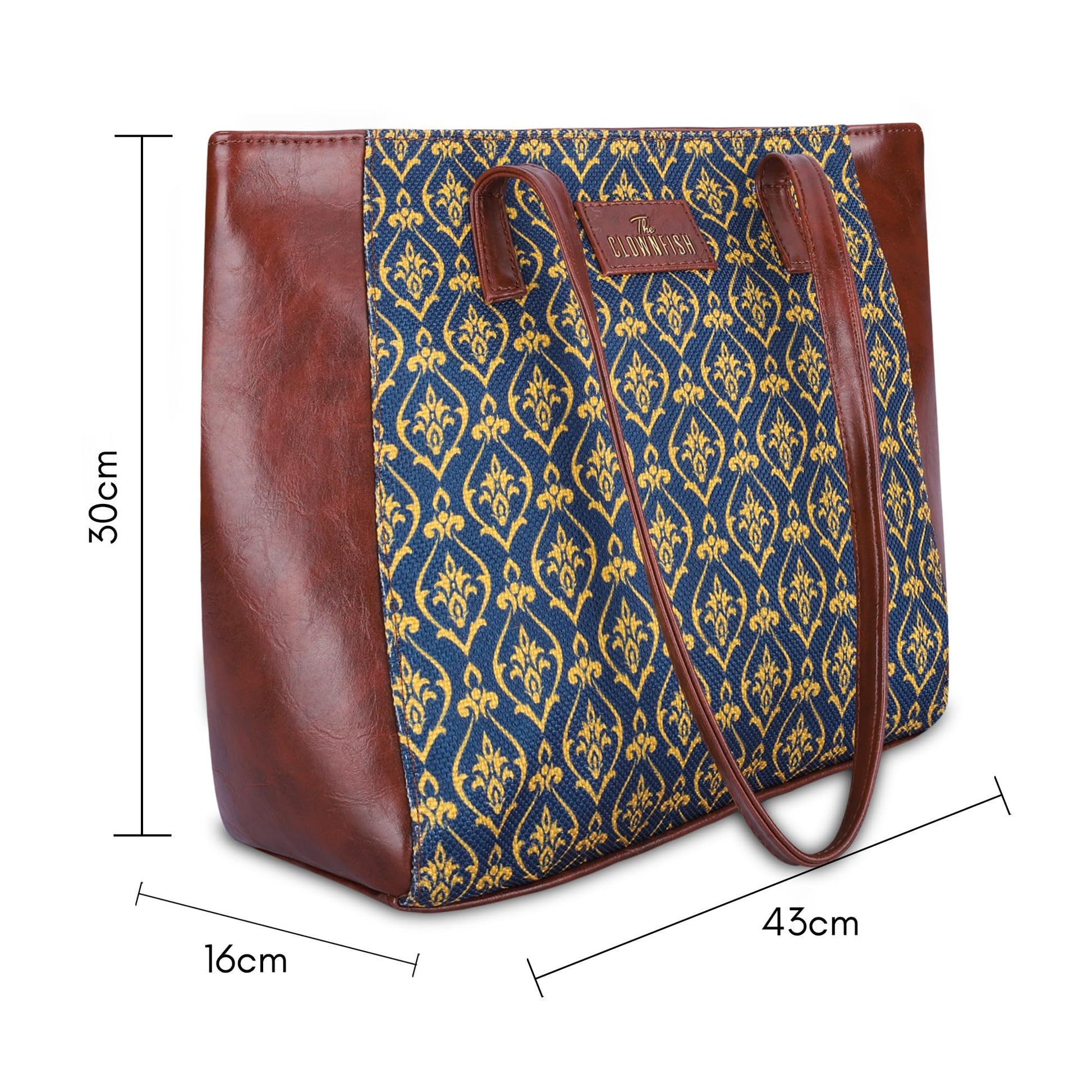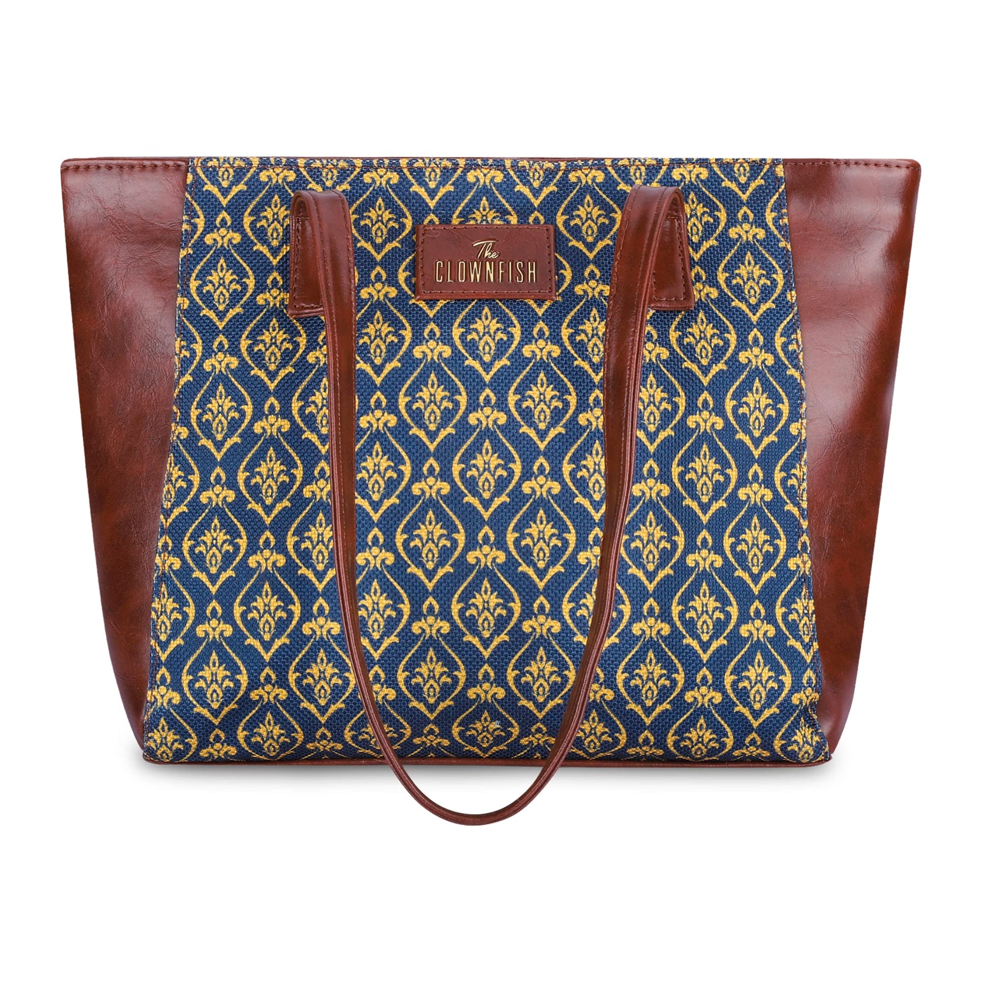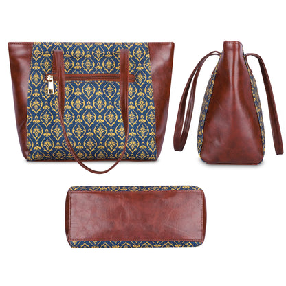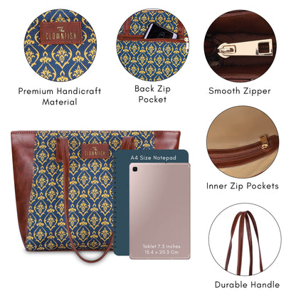 THE CLOWNFISH Valentine Printed Handicraft Fabric & Faux Leather Handbag for Women Office Bag Ladies Shoulder Bag Tote for Women College Girls (Midnight Blue)