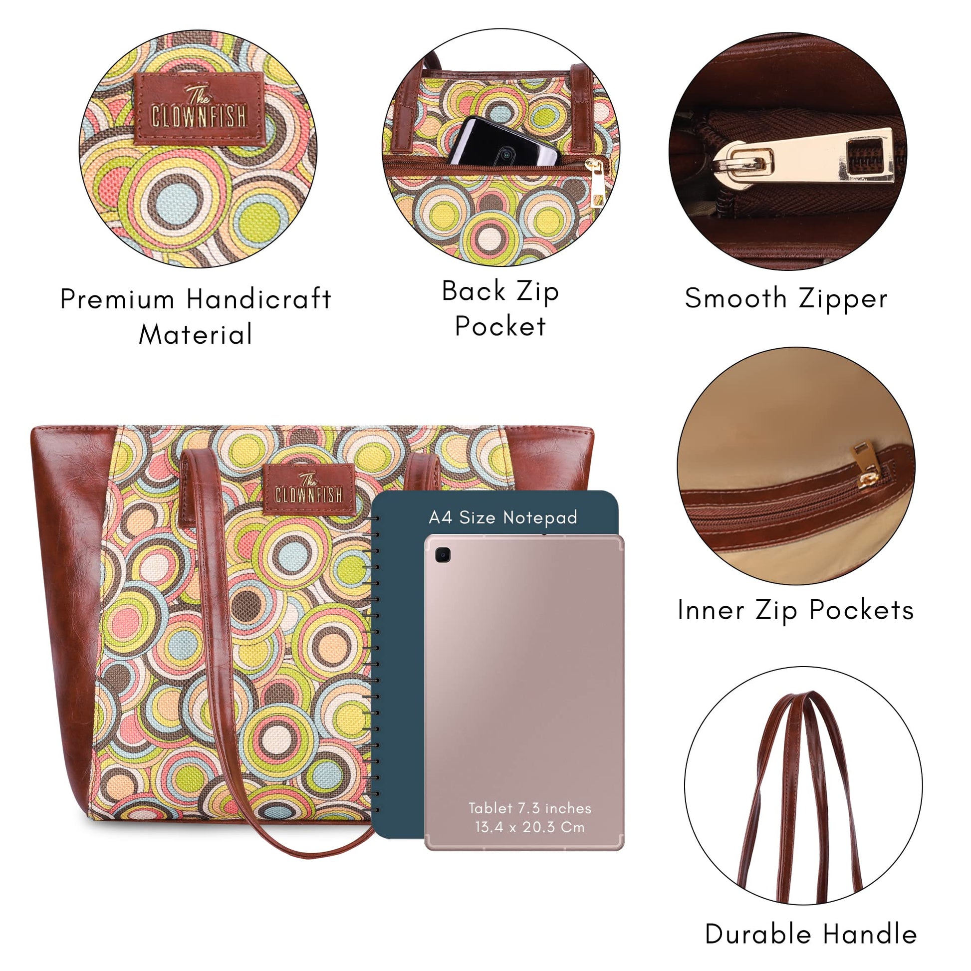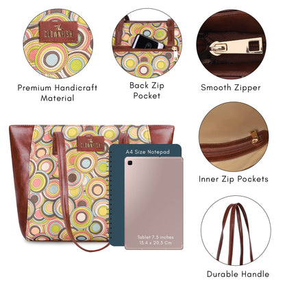 THE CLOWNFISH Valentine Printed Handicraft Fabric & Faux Leather Handbag for Women Office Bag Ladies Shoulder Bag Tote for Women College Girls (Multicolour-Circles)