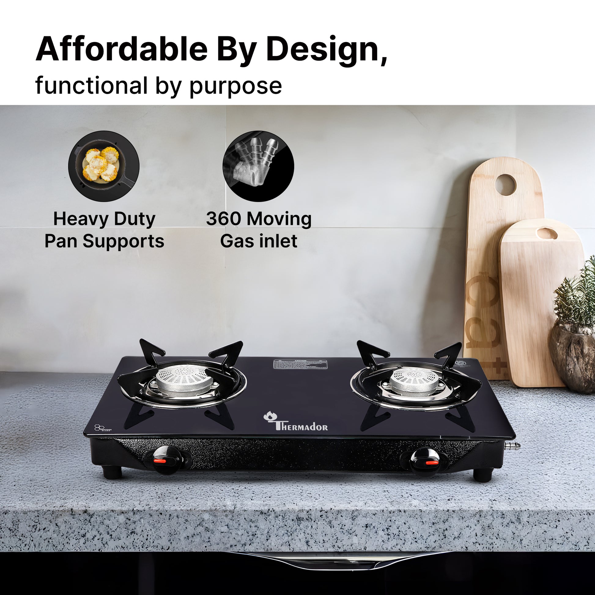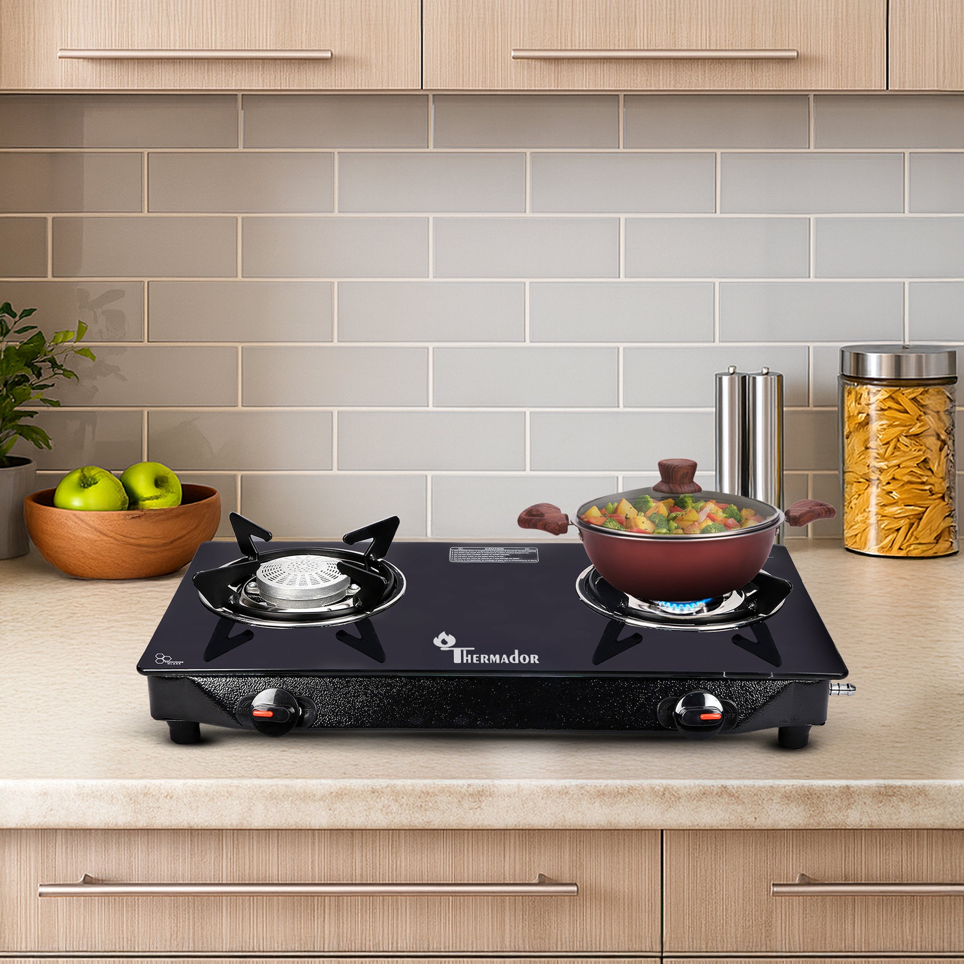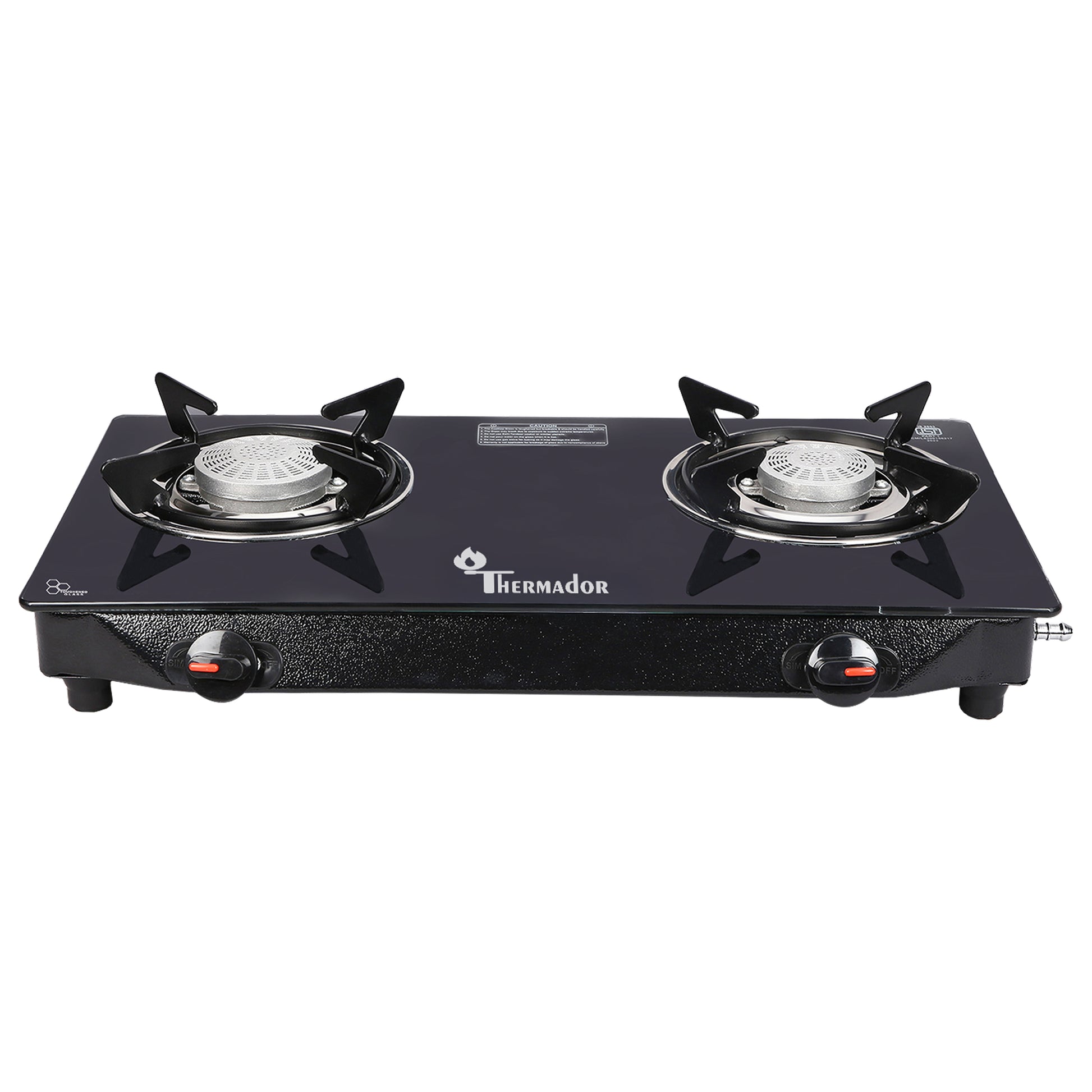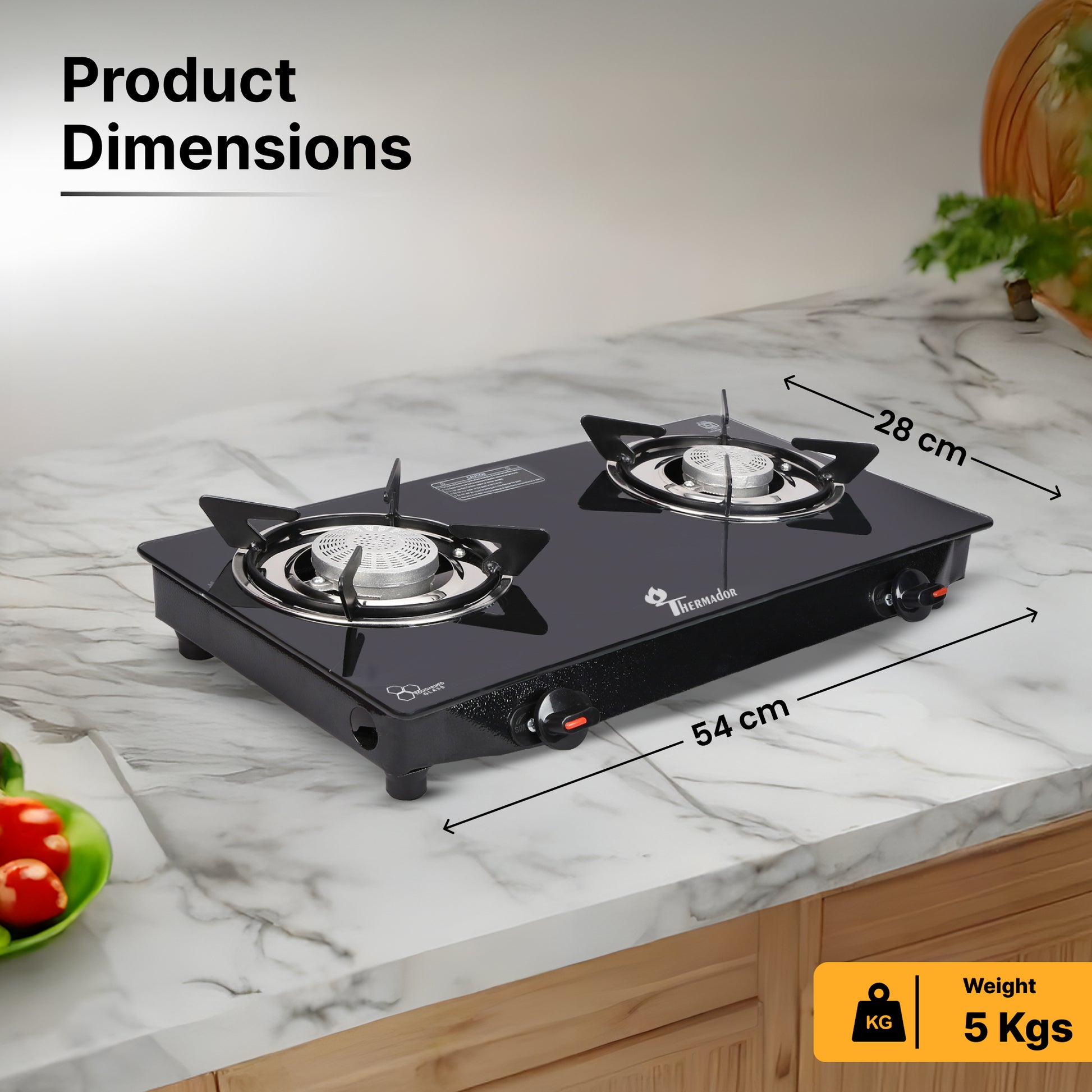 Introducing the 2 Burner Manual Ignition Gas Stove by Thermador, designed for modern kitchens and professional settings. This robust stove features a classic 6mm Powered Toughened Glass Top and is LPG compatible. Measuring 55.5 cm in length and 12 cm in height, it’s perfect for a wide array of cooking needs.