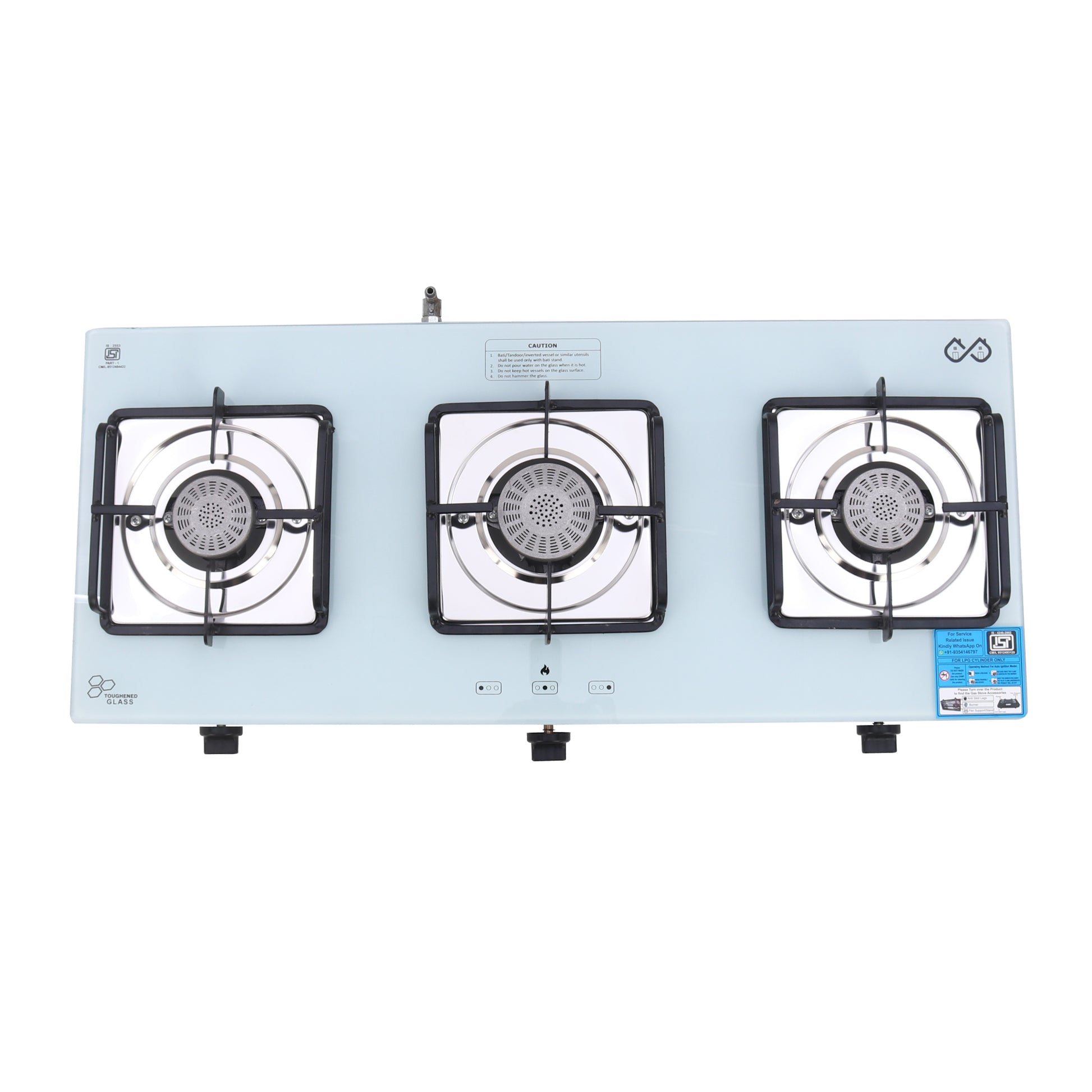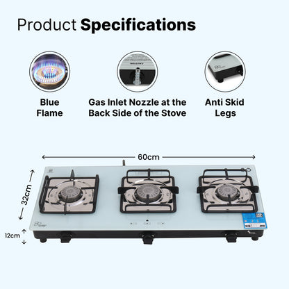 Gas Stove 3 Burners: ISI Certified Tornado Burner | Glass Cooktop | White