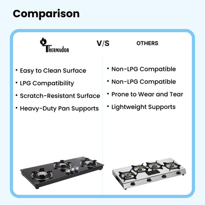 Thermador Gas Stove 3 Burners Hobtop Manual Ignition | 3 Burner Gas Stove with Die Cast Aluminium Burners | 6mm Toughened Glass Gas Chulha 3 Burner | LPG Compatible | ISI Certified |12 Months Warranty