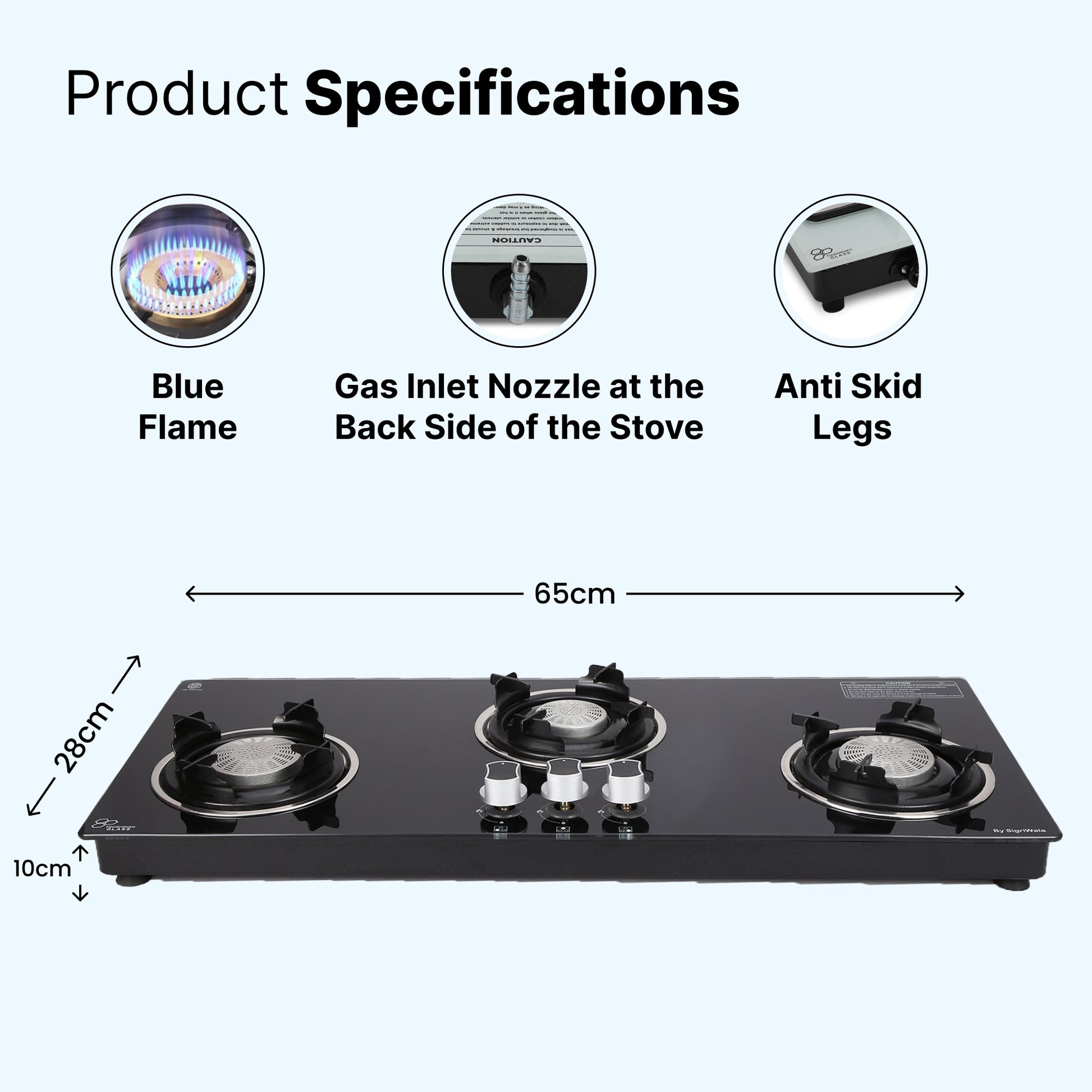 Gas Stove 3 Burners Hobtop Manual Ignition | 3 Burner Gas Stove with Die Cast Aluminium Burners | 6mm Toughened Glass Gas Chulha 3 Burner | LPG Compatible | ISI Certified |12 Months Warranty
