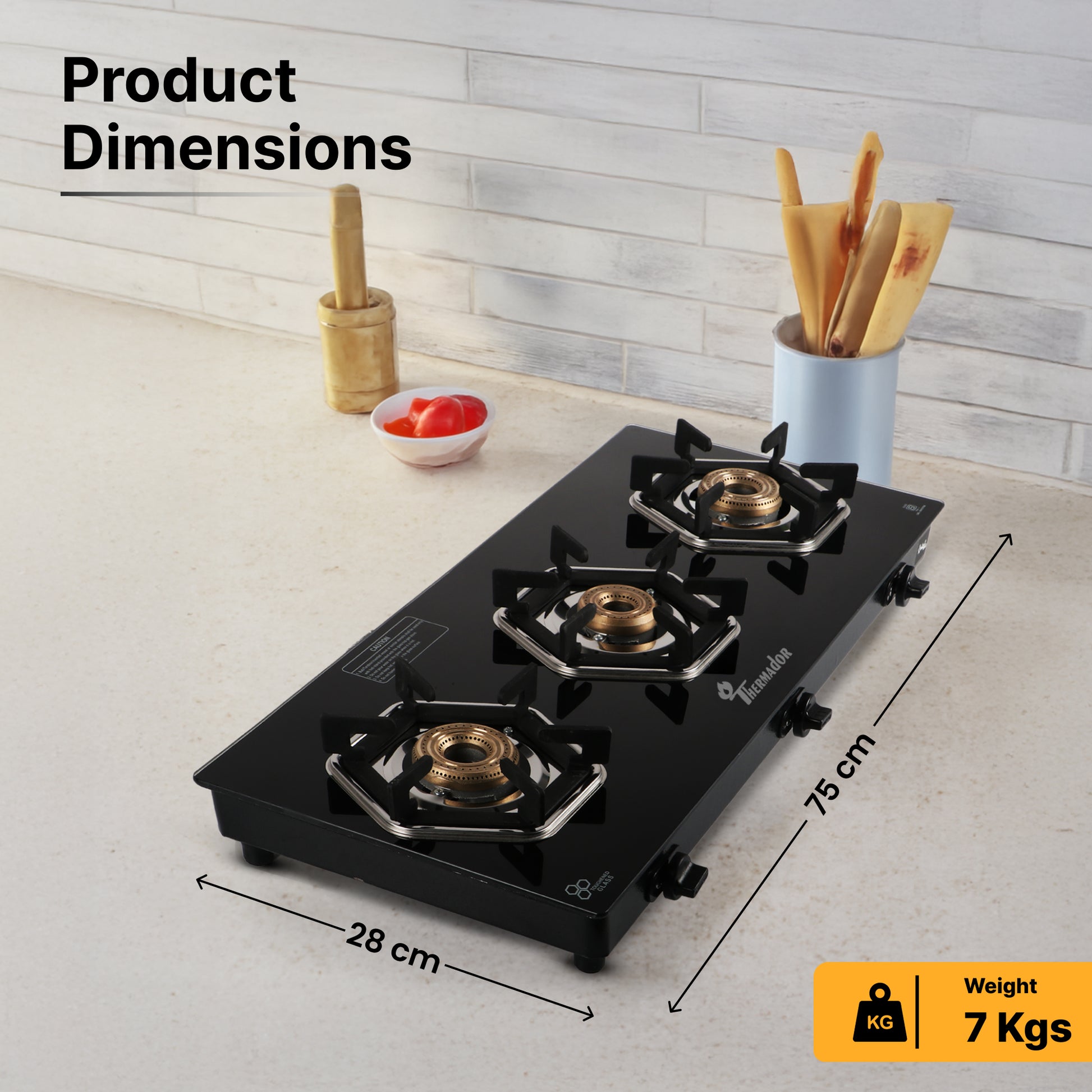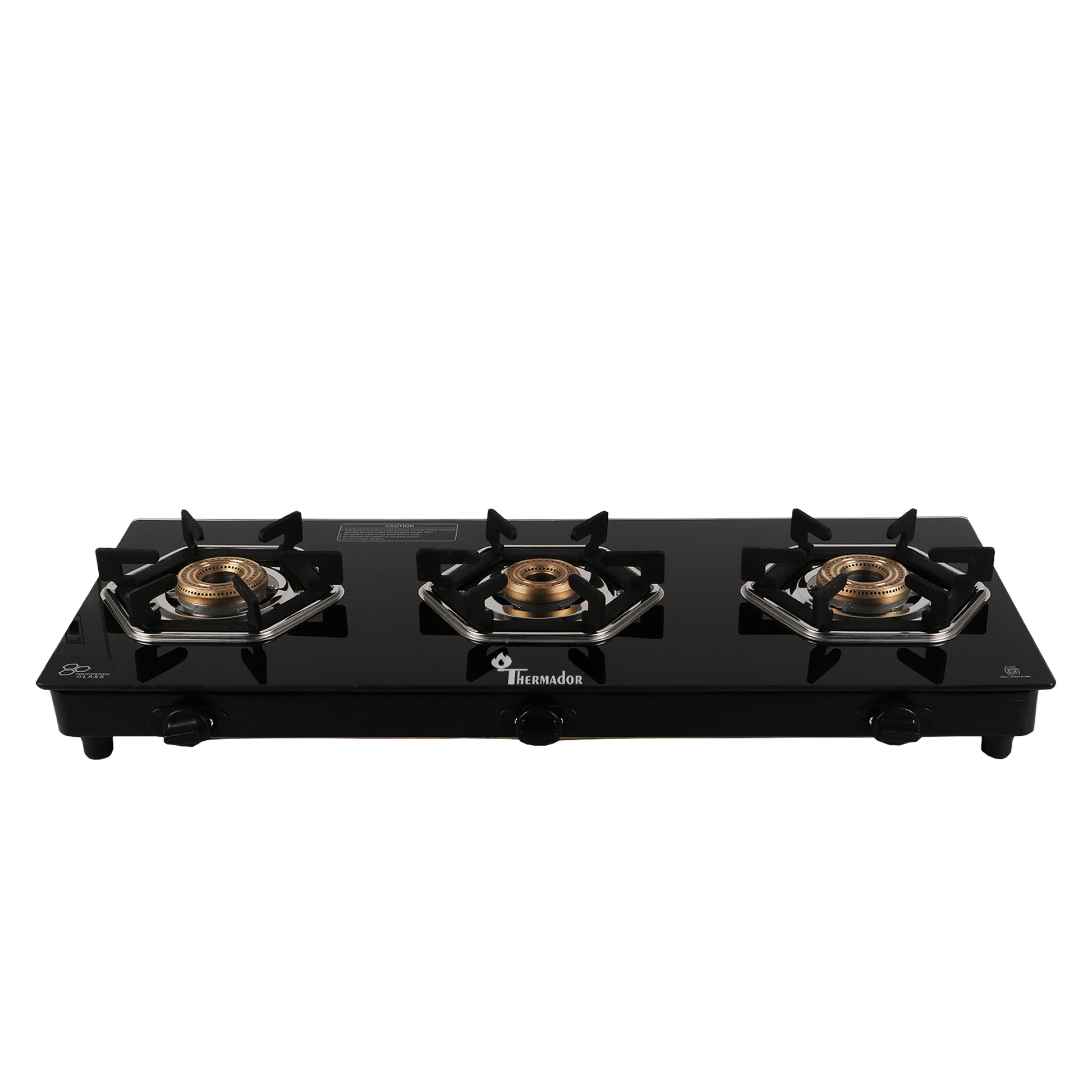 Thermador Noir 3 Burner Gas Stove: Auto Ignition with Brass Burners | 6mm Glass Top | LPG Compatible | Black