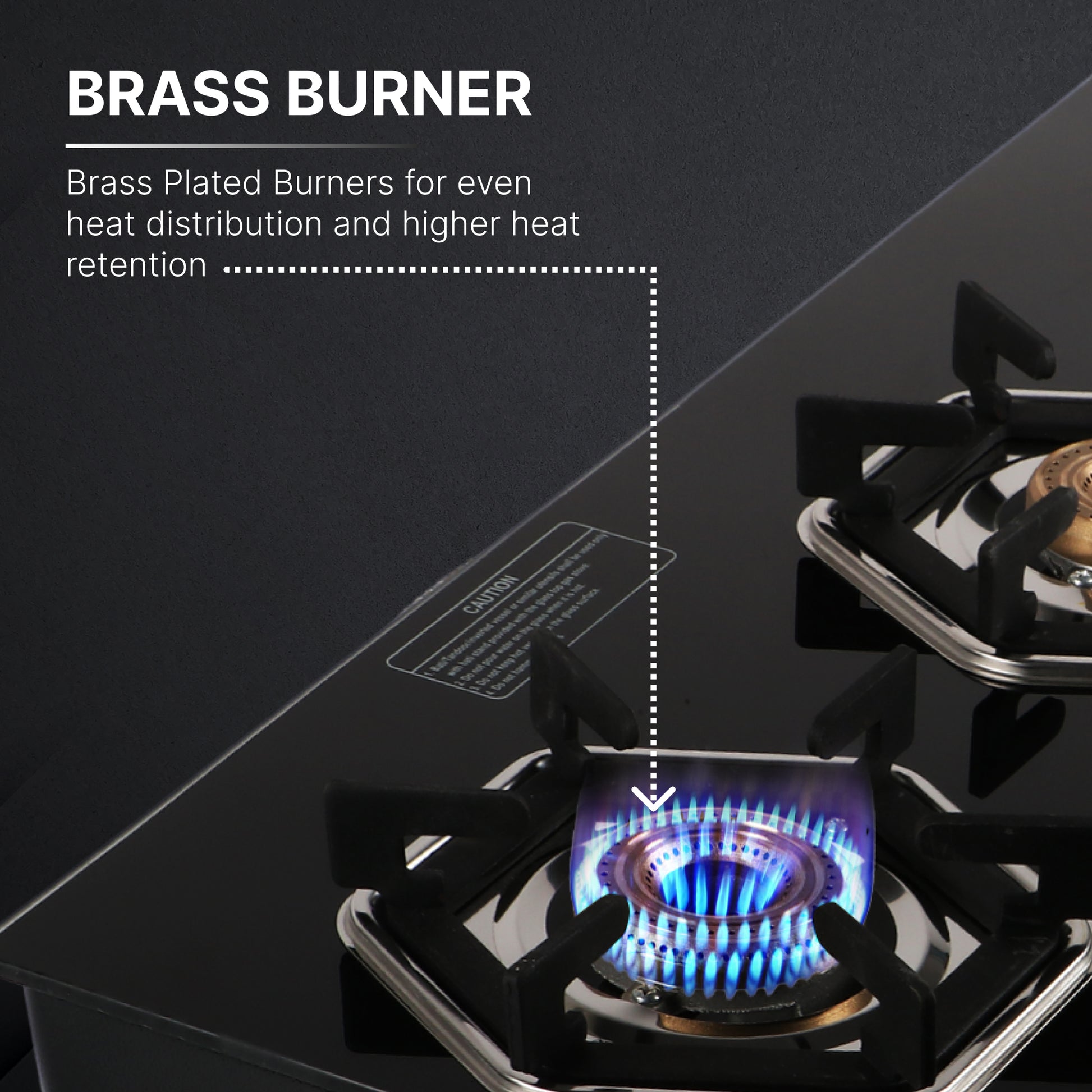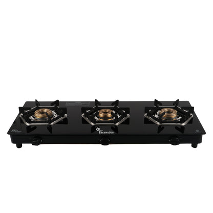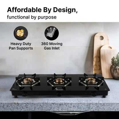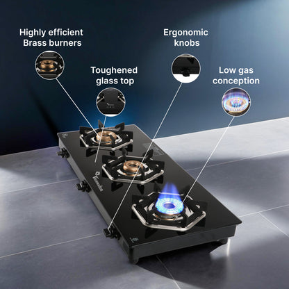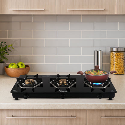 Noir 3 Burner Gas Stove: Auto Ignition with Brass Burners | 6mm Glass Top | LPG Compatible | Black