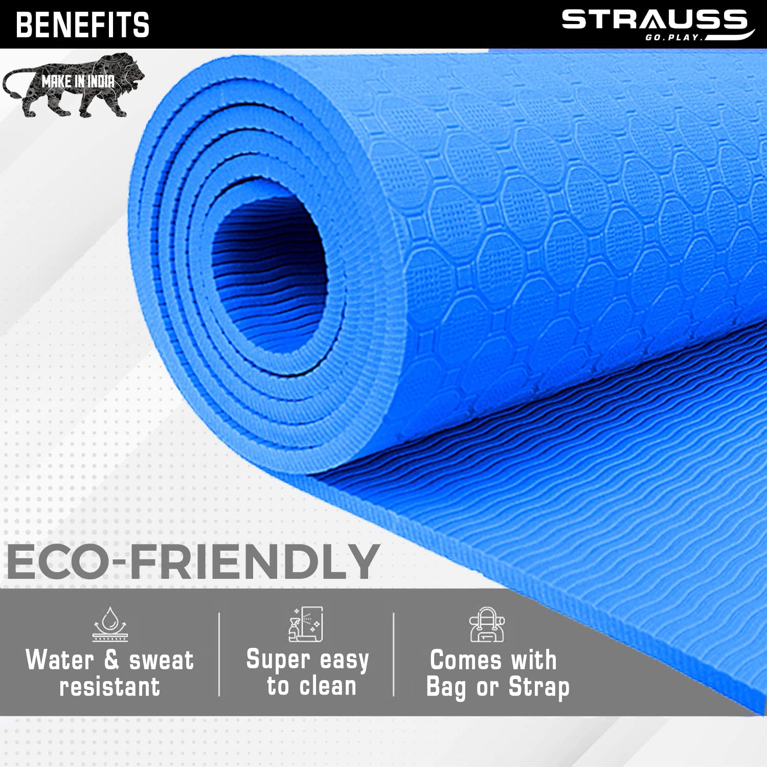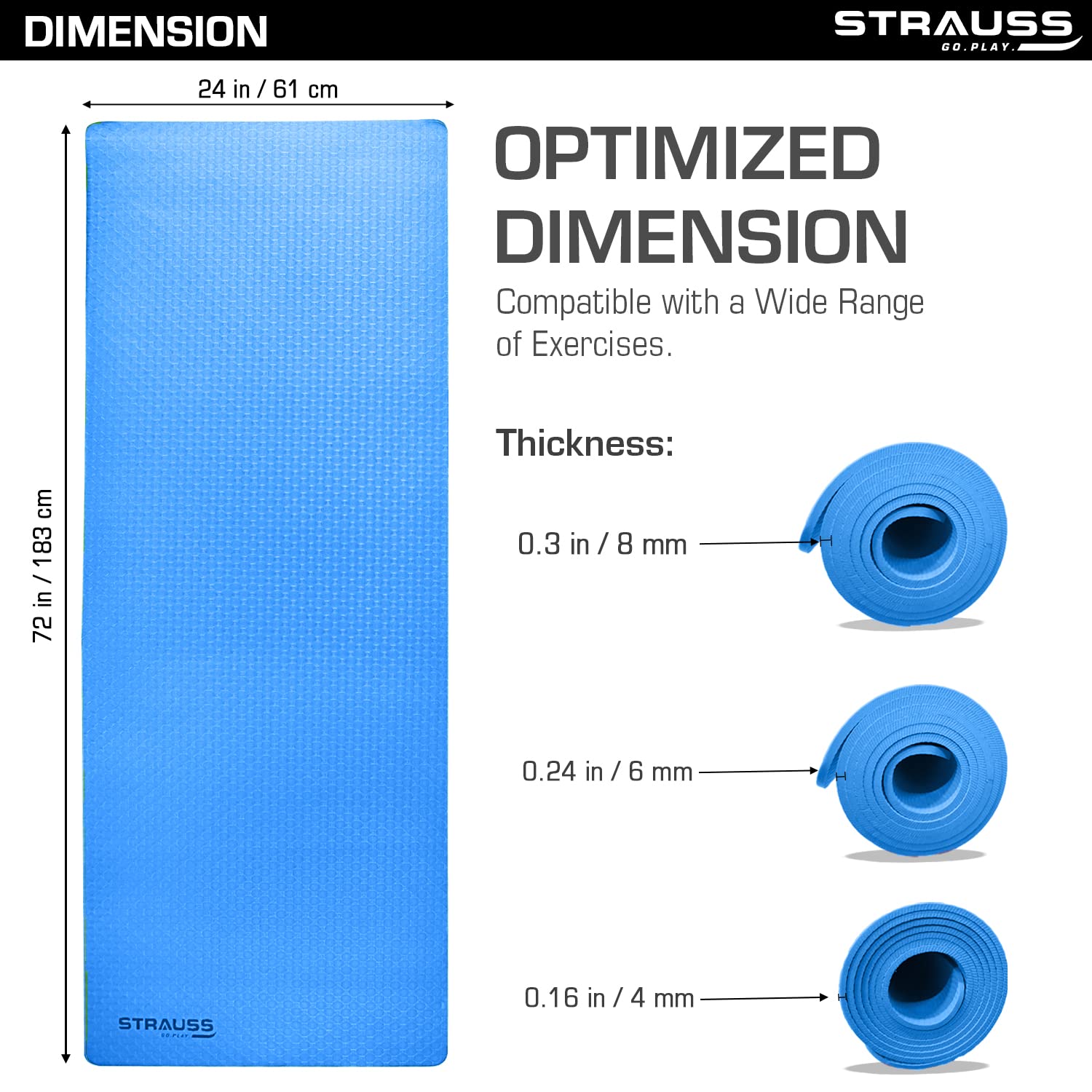 Introducing the TPE Yoga Mat by Strauss Sports, designed for the discerning fitness enthusiast. Measuring 6 feet long and 2 feet wide (183 cm X 61 cm), this 4 mm thick yoga mat is suitable for all shapes and sizes, ensuring maximum comfort during your workouts. Crafted from premium thermoplastic elastomers, this mat is both durable and lightweight. Included with the mat is a convenient carry strap for easy transport and storage.