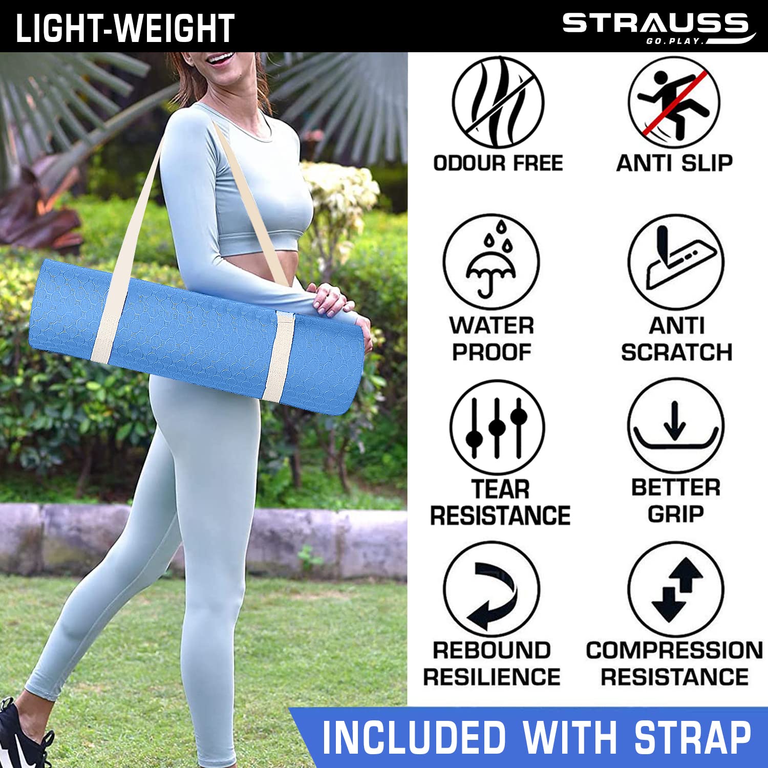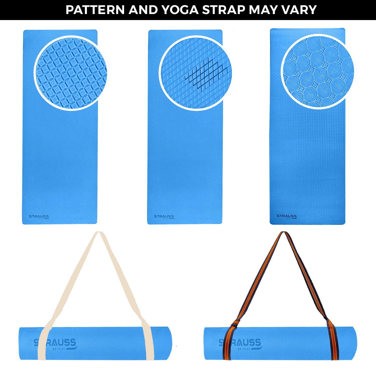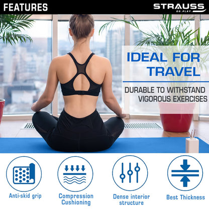 Strauss TPE Yoga Mat | Exercise Mat For Home Workout, Gym and Yoga Sessions | Anti Slip Gym Mat | Workout Mat For Men, Women and Kids | Yoga Mat With Carry Strap | Thickness: 4MM,(Sky Blue)