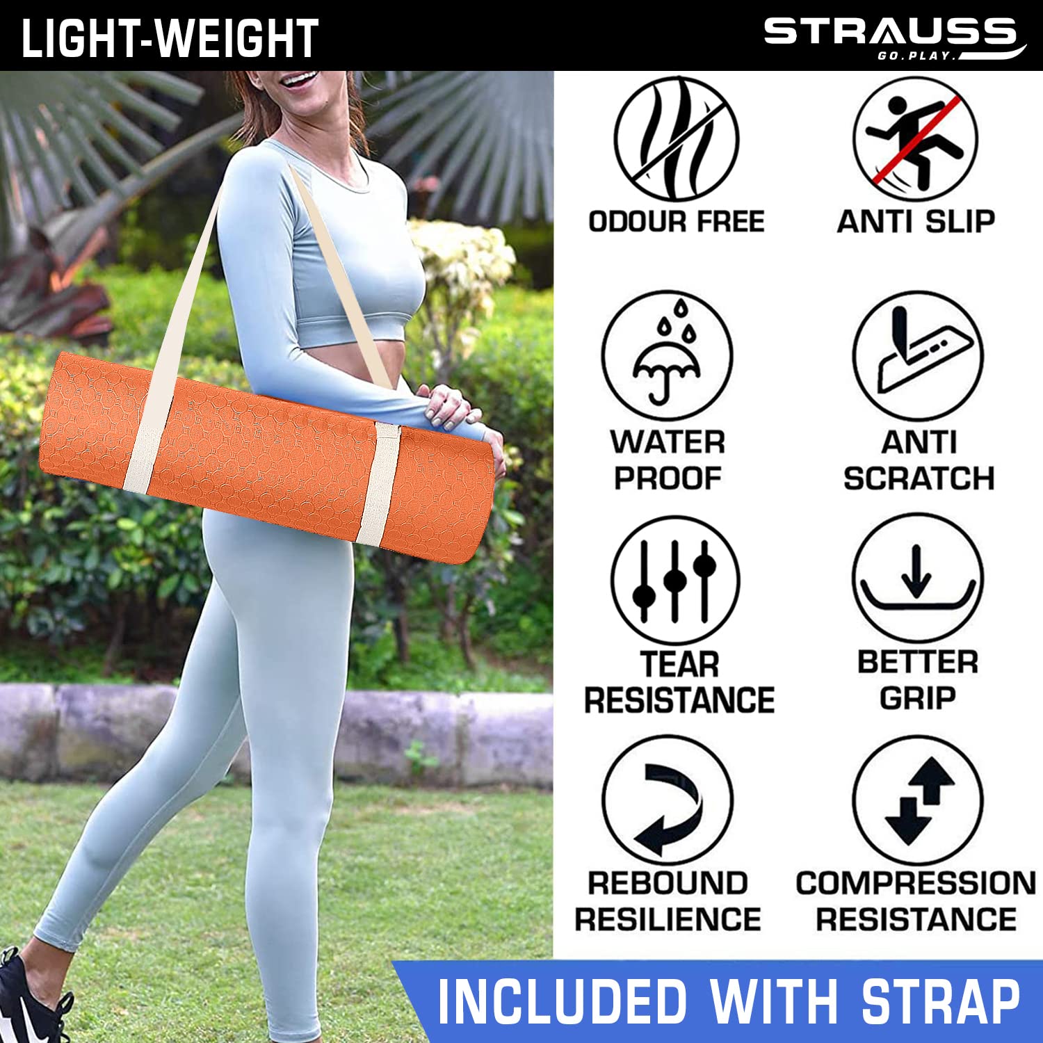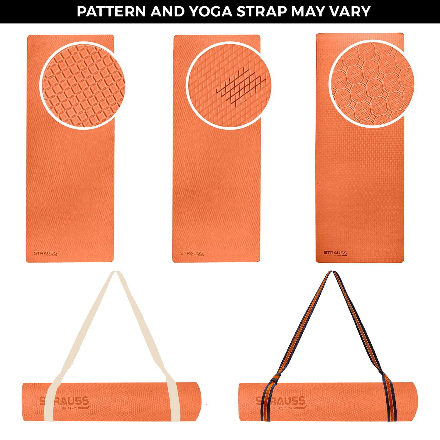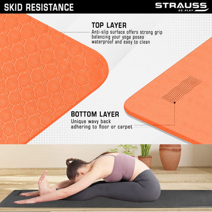 Strauss TPE Yoga Mat | Exercise Mat For Home Workout, Gym and Yoga Sessions | Anti Slip Gym Mat | Workout Mat For Men, Women and Kids | Yoga Mat With Carry Strap | Thickness: 6MM,(Orange)