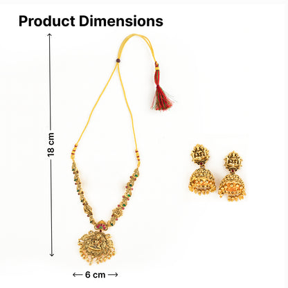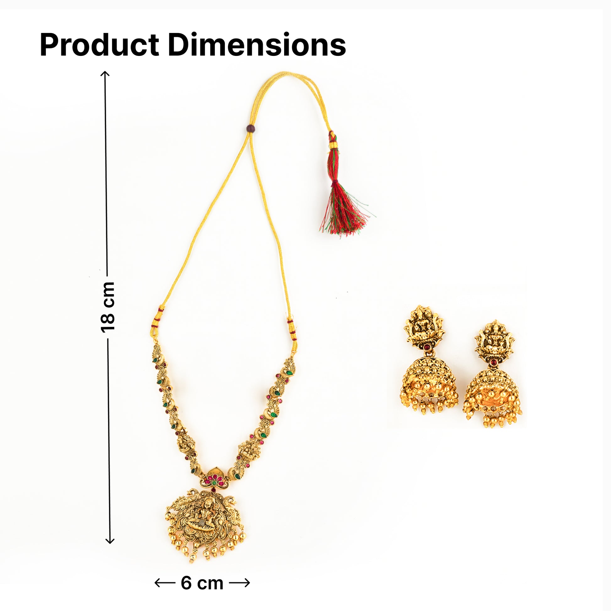 Introducing the Antique Gold Temple Jewellery Set by Yellow Chimes, a stunning collection designed for the modern woman who appreciates traditional elegance. This beautiful set features an intricate necklace adorned with exquisite peacock motifs on both sides, complemented by vibrant red and green stone accents that add a beautiful charm to the piece. At its center, the set boasts a detailed goddess-style pendant accompanied by matching jhumka earrings, showcasing a rich antique gold finish that enhances its classic aesthetic.