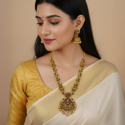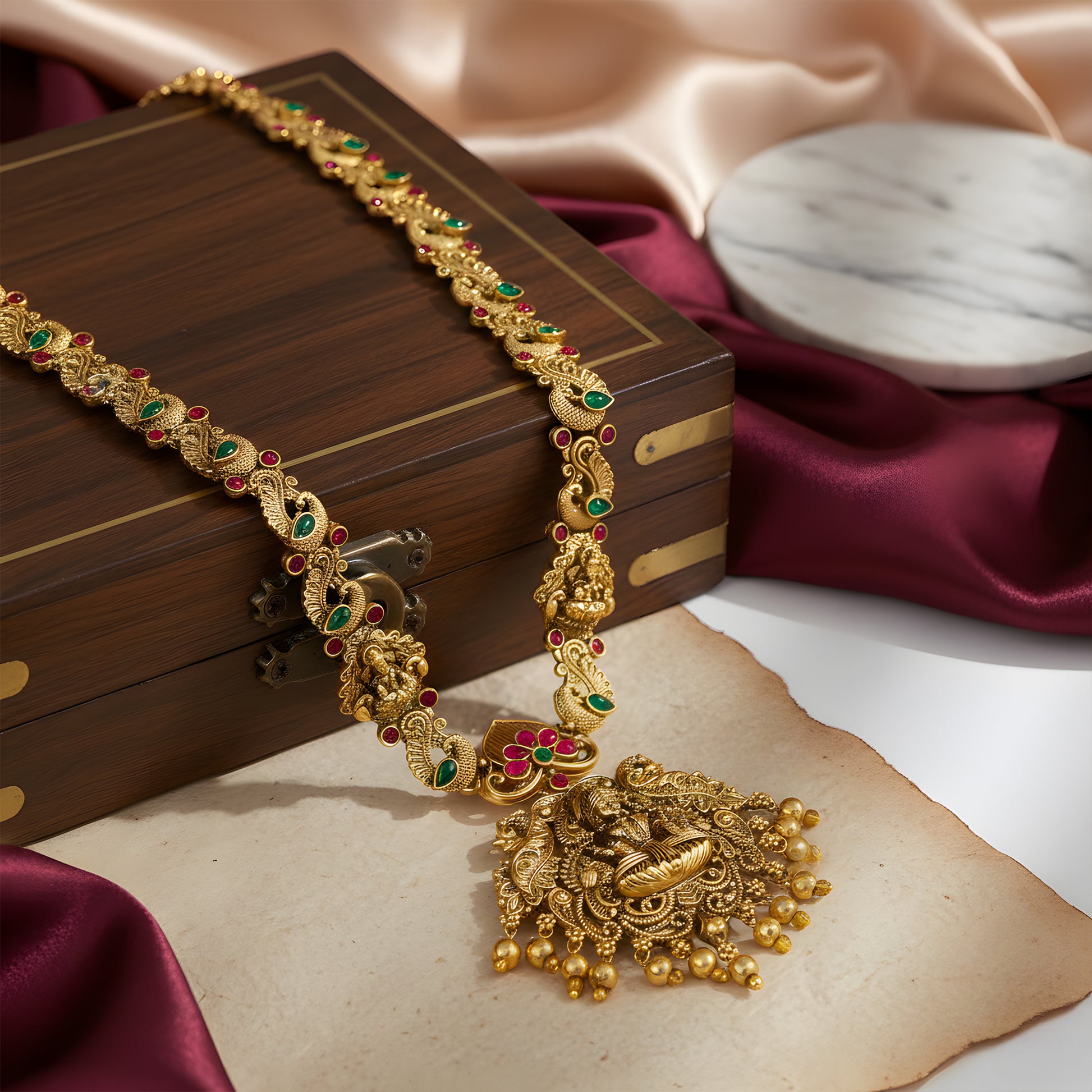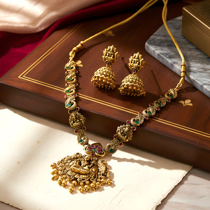 - ELEGANT DESIGN: Temple jewellery set with carved peacock motifs, goddess pendant, and antique gold detailing.