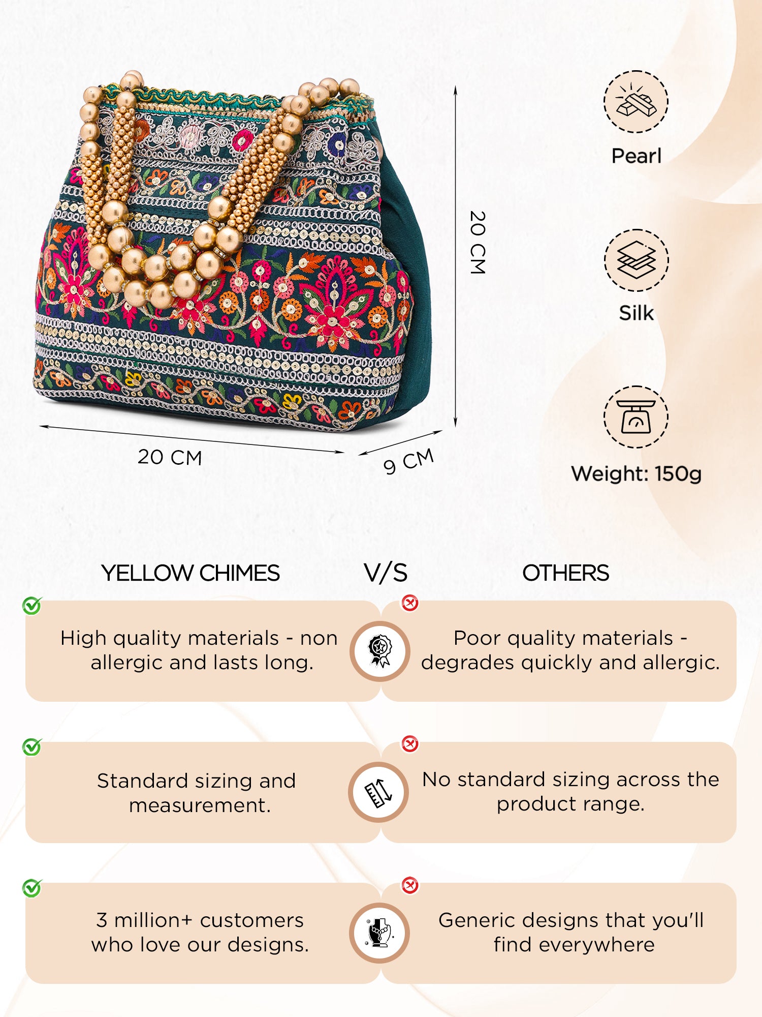 Yellow Chimes Potli Bags For Ladies For Wedding | Traditional Potli Handbags For Women | Pearl Beaded Wristlet Handmade Embroidery Worked Potli Bag | Ideal for Parties Weddings or Traditional Events