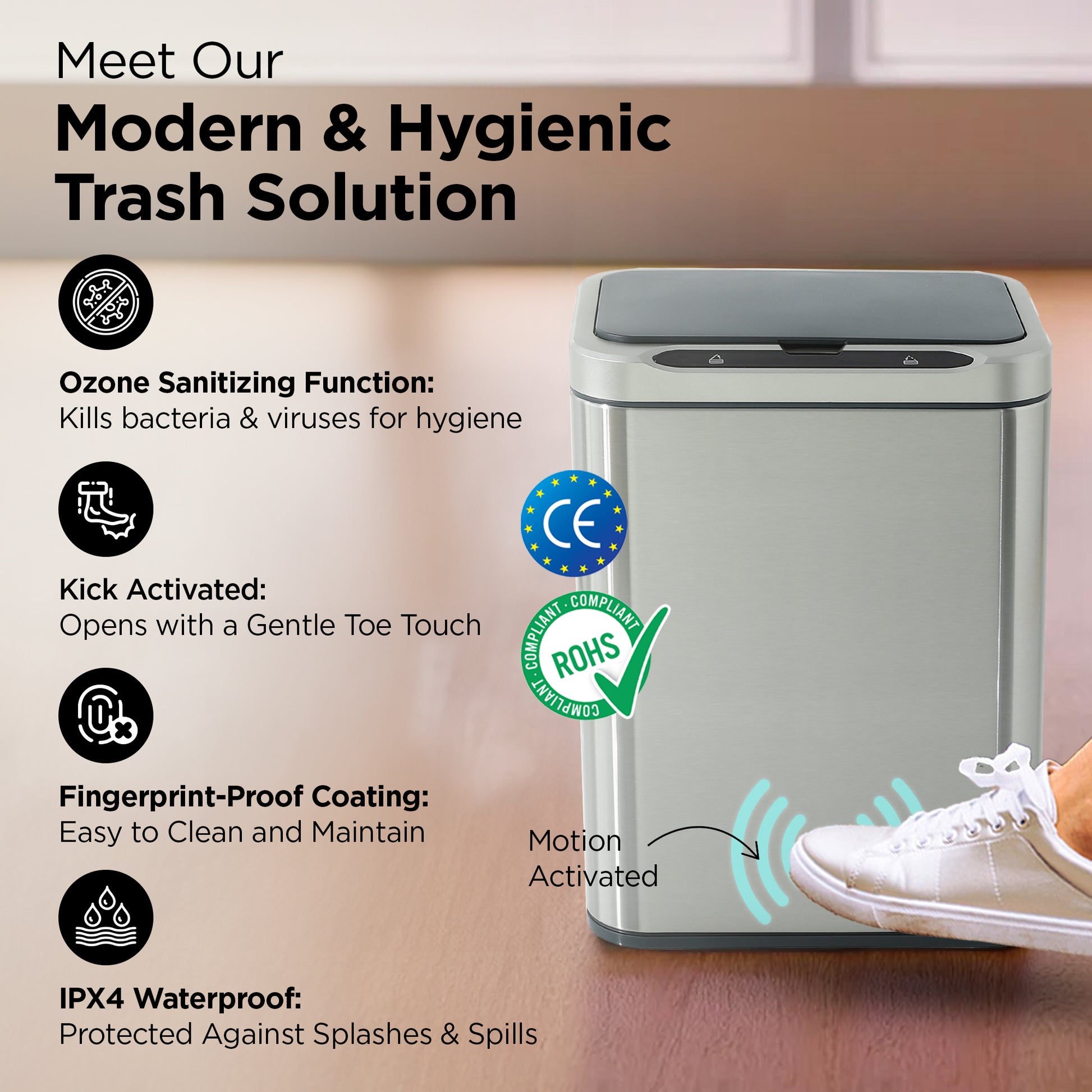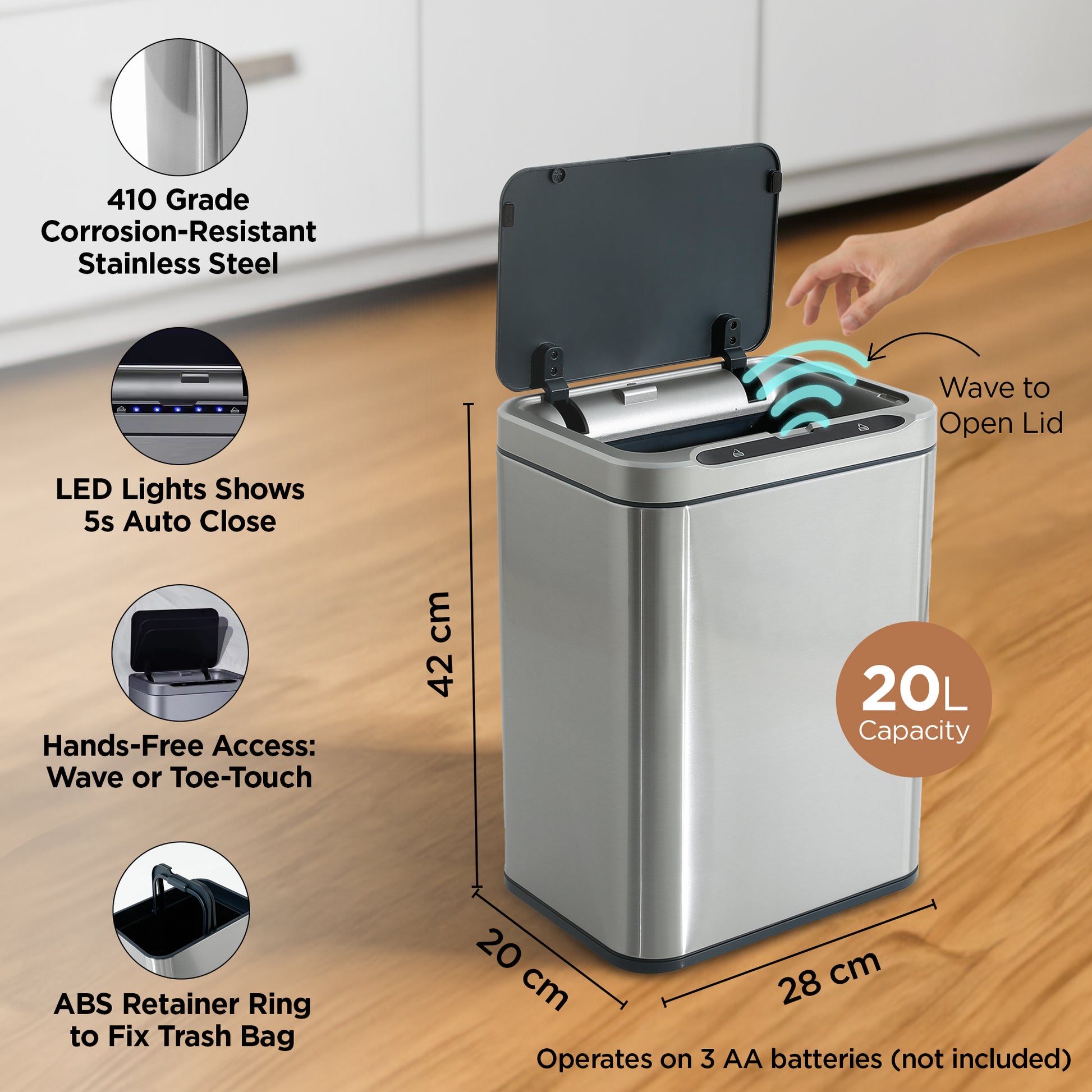 20L Stainless Steel Dustbin: Automatic Sensor Trash Bin with Ozone Sanitizing | Silver