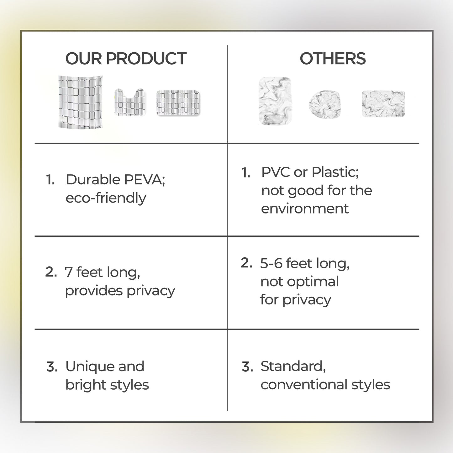 - Durable & Waterproof: Crafted from high-quality PEVA material, our shower curtain provides exceptional durability and waterproof protection, ensuring long-lasting use while safeguarding against water damage.