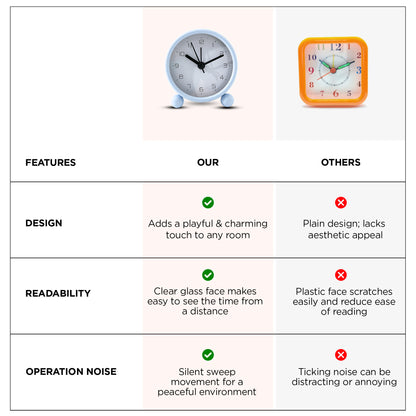 With an efficient alarm system powered by batteries, you can count on this clock to wake you up on time every day. The non-ticking feature ensures minimal noise disturbance, providing a serene atmosphere whether placed in your bedroom or on your study table. Its appealing design makes the UMAI Alarm Clock not just a timepiece, but also a stylish decor item that enhances your room's overall aesthetic.