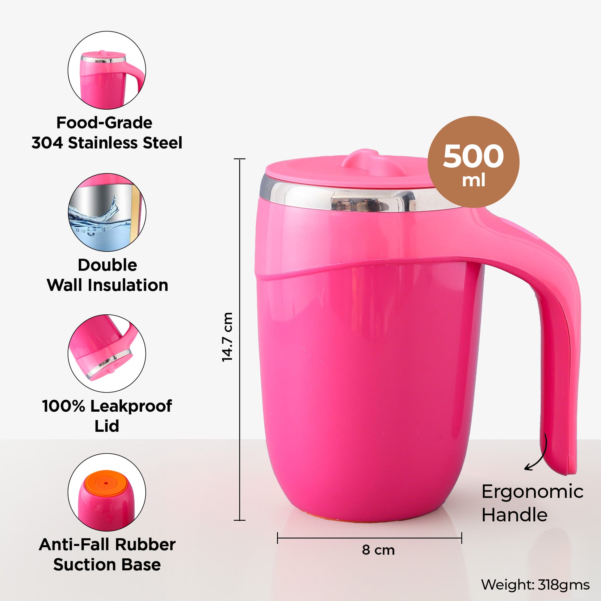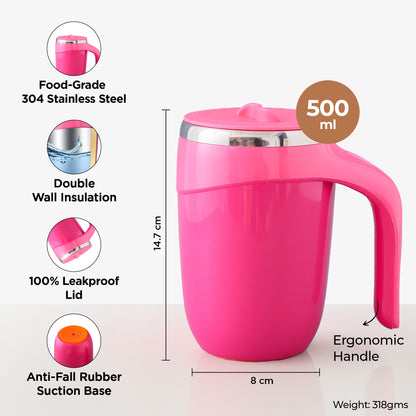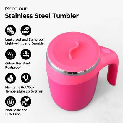 UMAI Anti Fall Tumbler Stainless Steel with Lid & Handle (500ml) | Doubled Walled Insulated Coffee Mug| Leakproof Lid| BPA Free |Insulated Coffee Tumbler for Home, Office | Pink