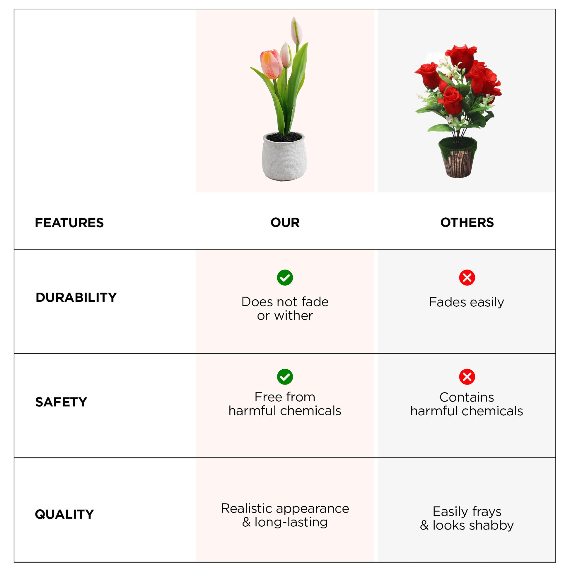 UMAI Artificial Plants for Home Decor Items with Pot (26CM) Aesthetic Room Decor Items for Bedroom| Office Table Accessories| Pink Tulip Flowers Artificial| Living Room Decorative Items for Home Artificial Flowers for Decoration & Artificial Plants for home decor are crafted with meticulous attention to detail which makes it unique among home decor items. Realistic customer-centric design that eliminates size and leaf concerns, meeting customer expectations with lifelike appearance. Artificial Flowers for decoration brightens any room with its durable, easy-to-clean design. Good-Quality Craftsmanship: Realistic Flowers & leaves are crafted with meticulous attention to detail which makes it unique among home decor items.