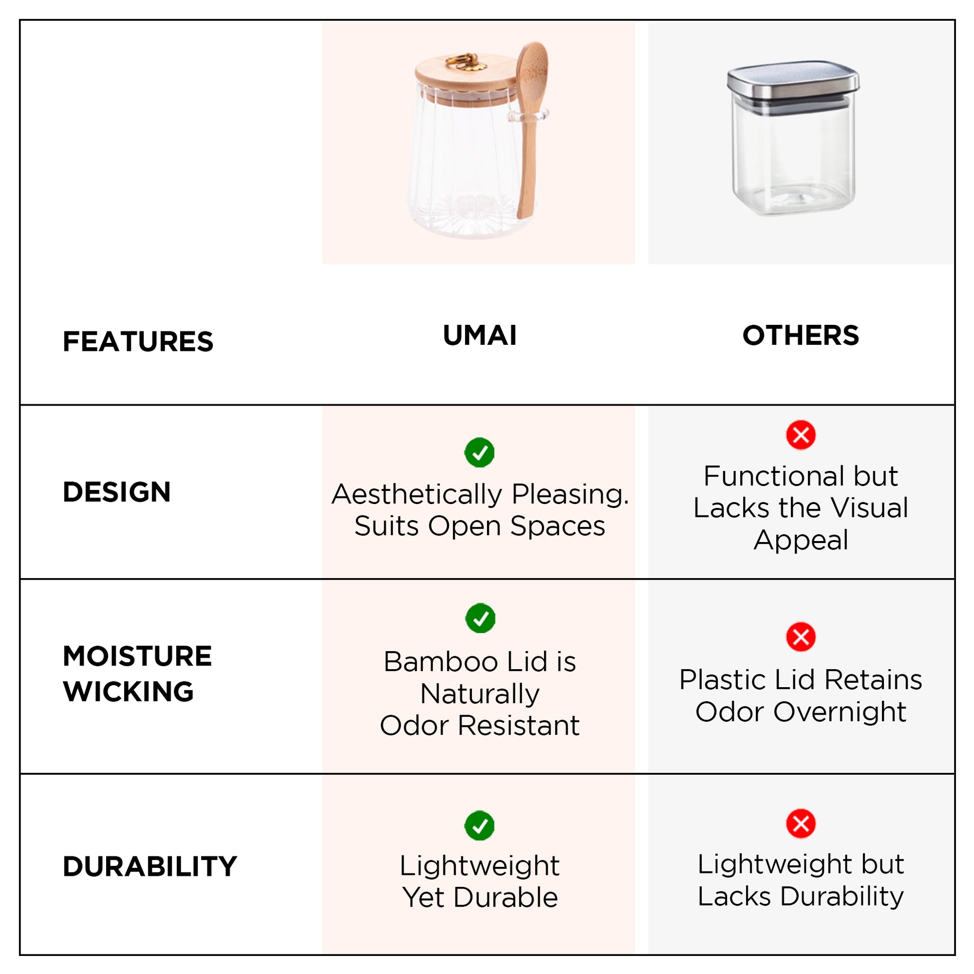 • Elegant Design: The sophisticated and minimalistic design of the UMAI jar complements any kitchen decor while its transparent glass allows for easy content identification.