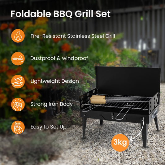 Barbecue Grill Set: Portable Charcoal Grill with 6 Skewers | Foldable | Black