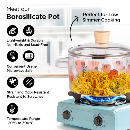 Borosilicate Glass Saucepan With Lid&Handle (1.45L)|Polished Electric Pottery Safe|Handi For Cooking|Microwave Safe|Cooktop For Tea/Milk/Pasta/Noodles/Rice|Transparent-Flower Print,1450Ml