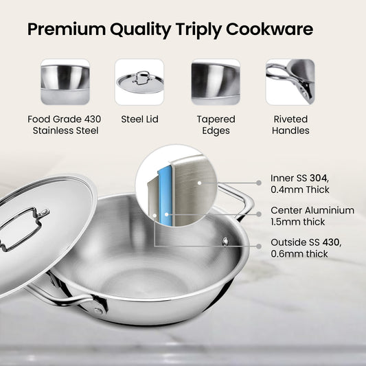 Triply Stainless Steel Kadai with Lid | 22 cm Diameter | 2.2 L Capacity | Stove & Induction Cookware | Heat Surround Cooking | Triply Stainless Steel cookware with lid