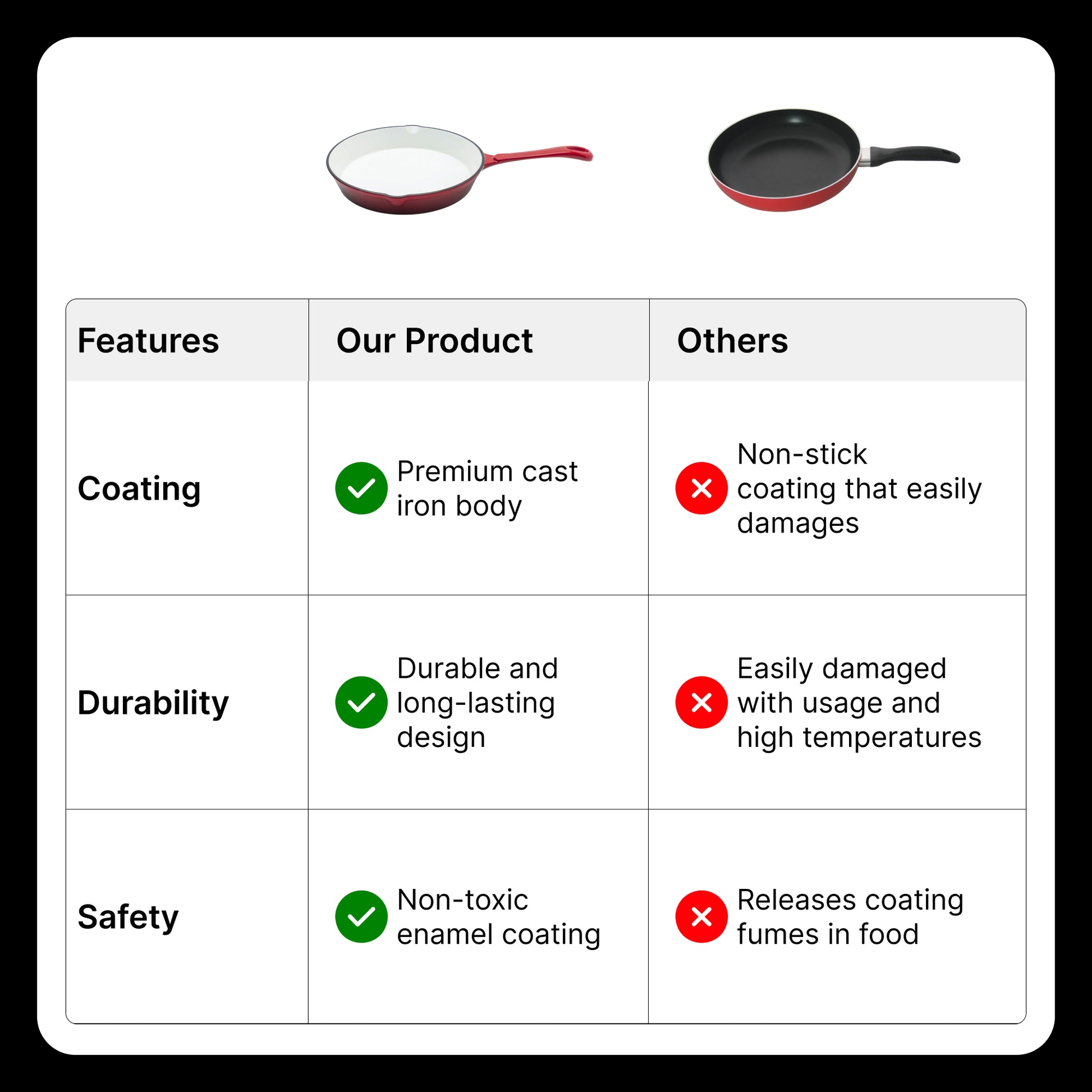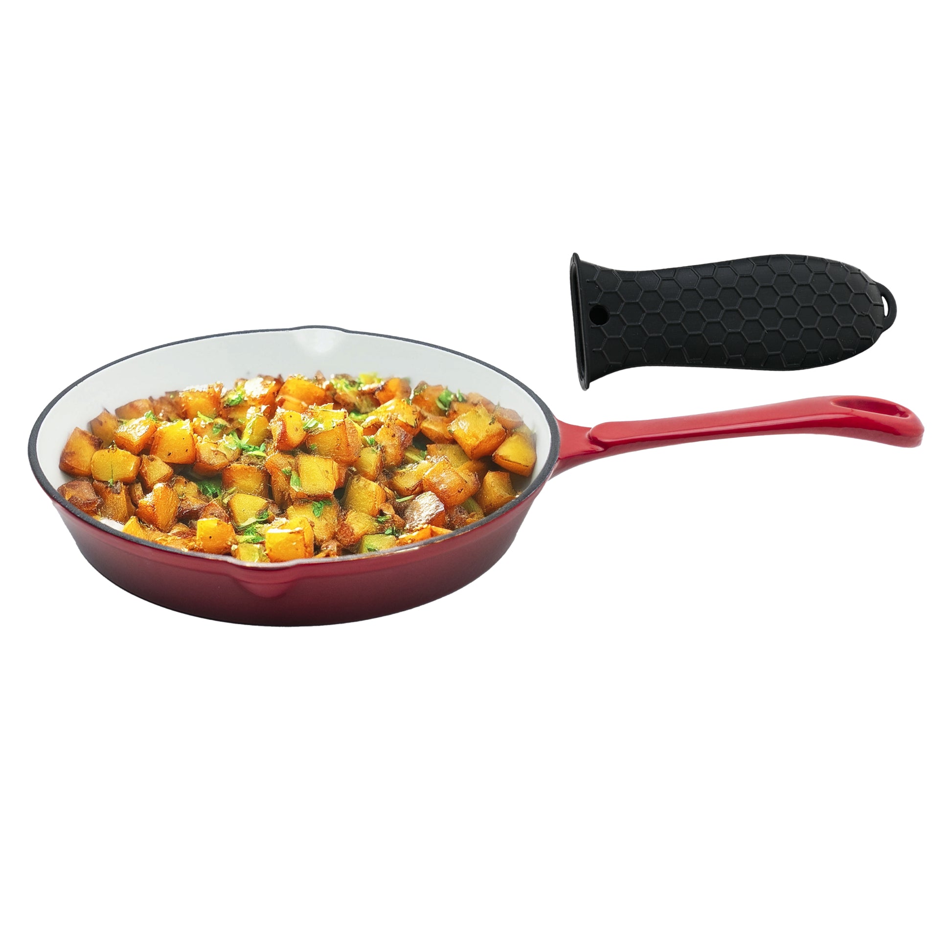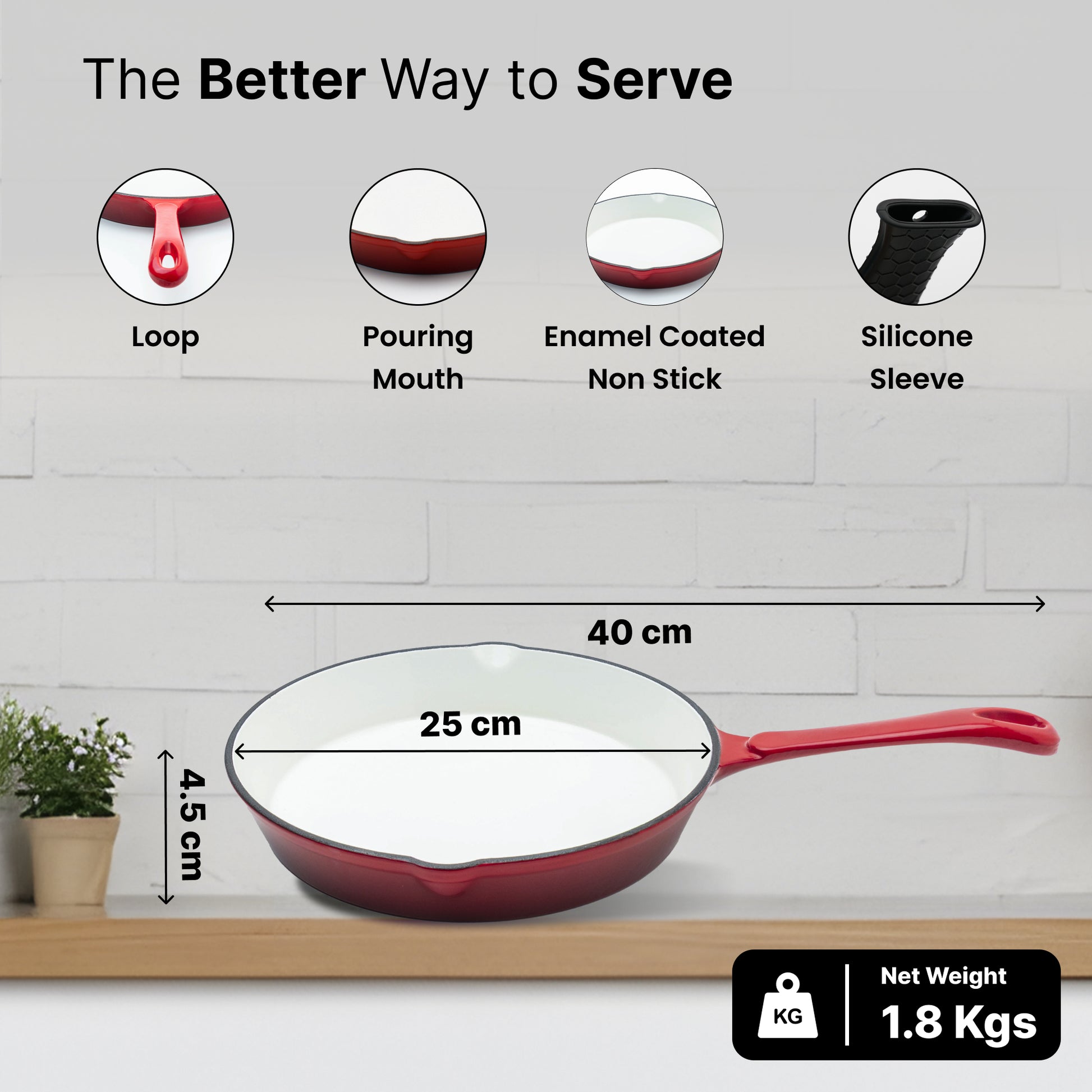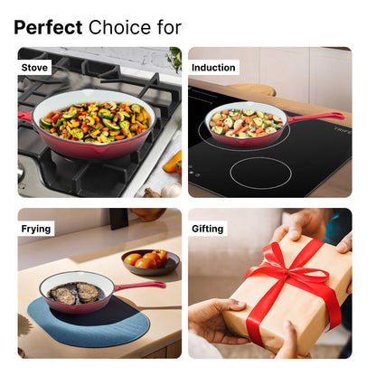• DURABLE & EVEN HEATING: 25cm red enameled cast iron pan ensures a rust-proof and non-stick experience.